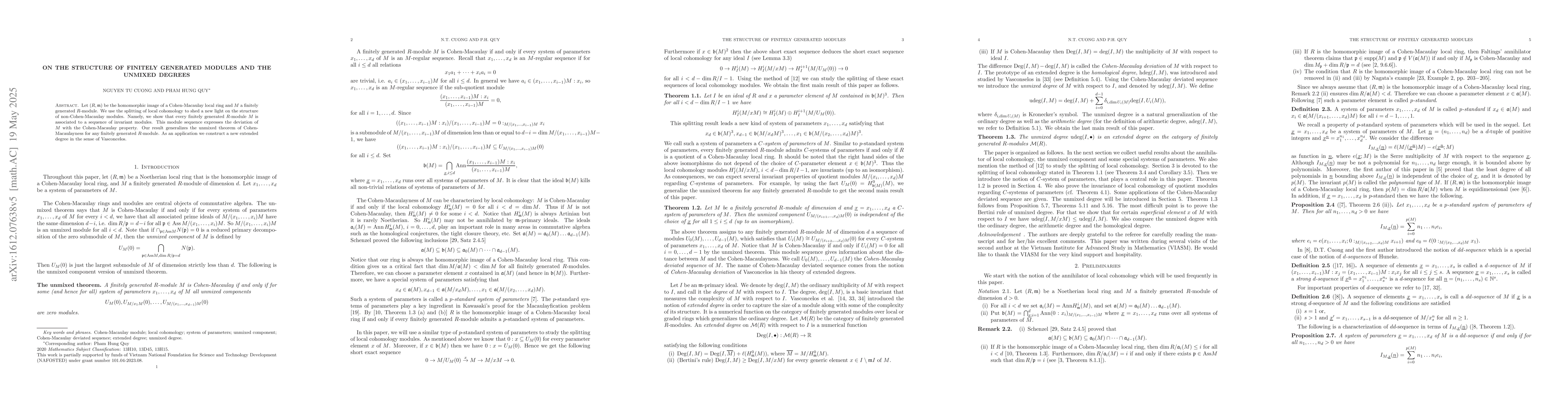 Let $(R, \frak m)$ be a homomorphic image of a Cohen-Macaulay local ring and $M$ a finitely generated $R$-module. We use the splitting of local cohomology to shed a new light on the structure of non-Cohen-Macaulay modules. Namely, we show that every finitely generated $R$-module $M$ is associated by a sequence of invariant modules. This modules sequence expresses the deviation of $M$ with the Cohen-Macaulay property. This result generalizes the unmixed theorem of Cohen-Macaulayness for any finitely generated $R$-module. As an application we construct a new extended degree in sense of Vasconcelos.