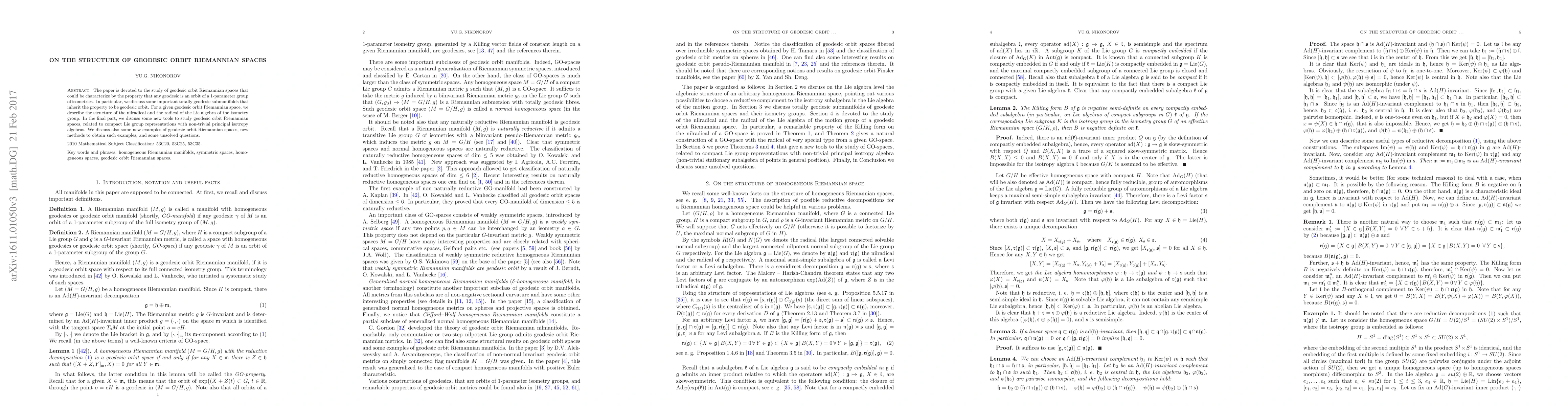 This paper investigates geodesic orbit Riemannian spaces where any geodesic is an orbit of a 1-parameter group of isometries, exploring their structure and Lie algebra properties, including nilradical and radical, and introduces new tools and examples based on compact Lie group representations.