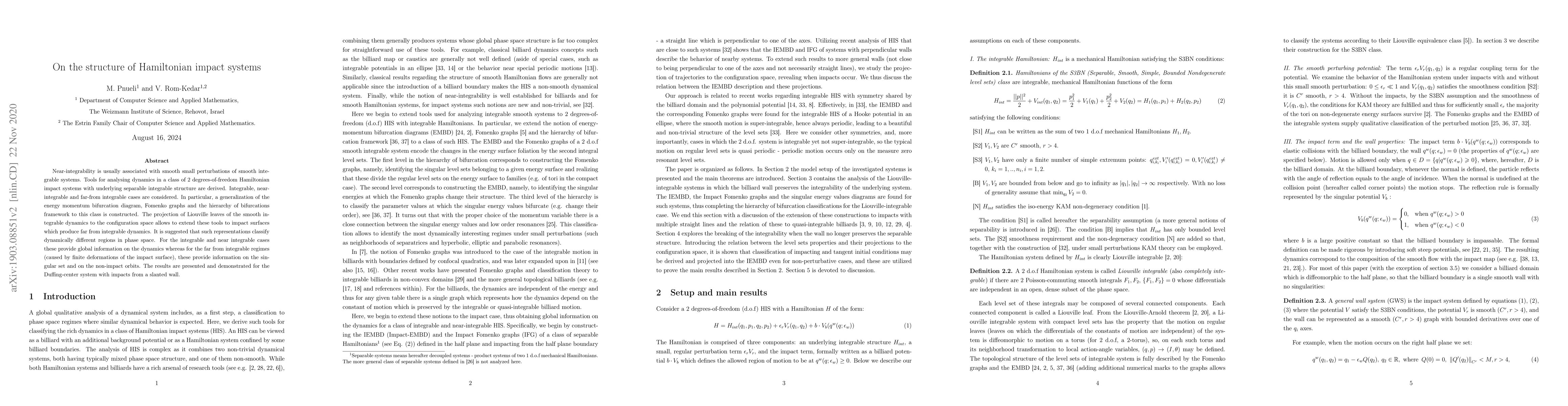 This paper explores the dynamics of Hamiltonian impact systems with integrable structures, classifying different types of trajectories under perturbations. It introduces tools like energy momentum bifurcation diagrams and Fomenko graphs to analyze the behavior of these systems, providing global insights for near-integrable cases and rough classifications for non-perturbative regimes.