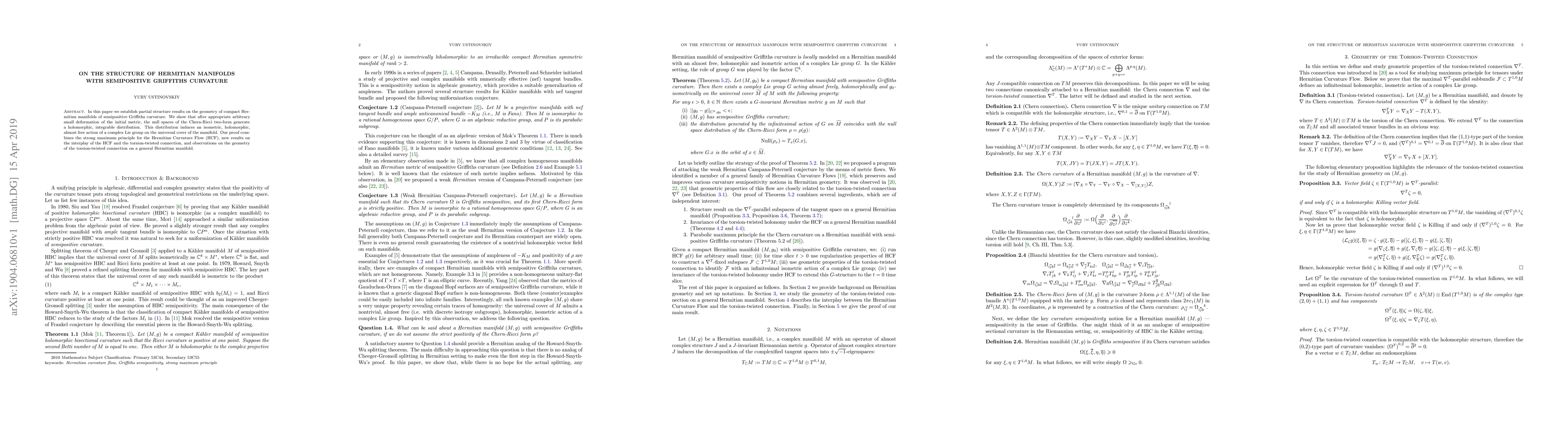 This paper establishes structure results for compact Hermitian manifolds with semipositive Griffiths curvature, showing that small metric deformations lead to a holomorphic, integrable distribution. This distribution enables an almost free holomorphic action of a complex Lie group on the manifold's universal cover, leveraging the Hermitian Curvature Flow and the torsion-twisted connection.