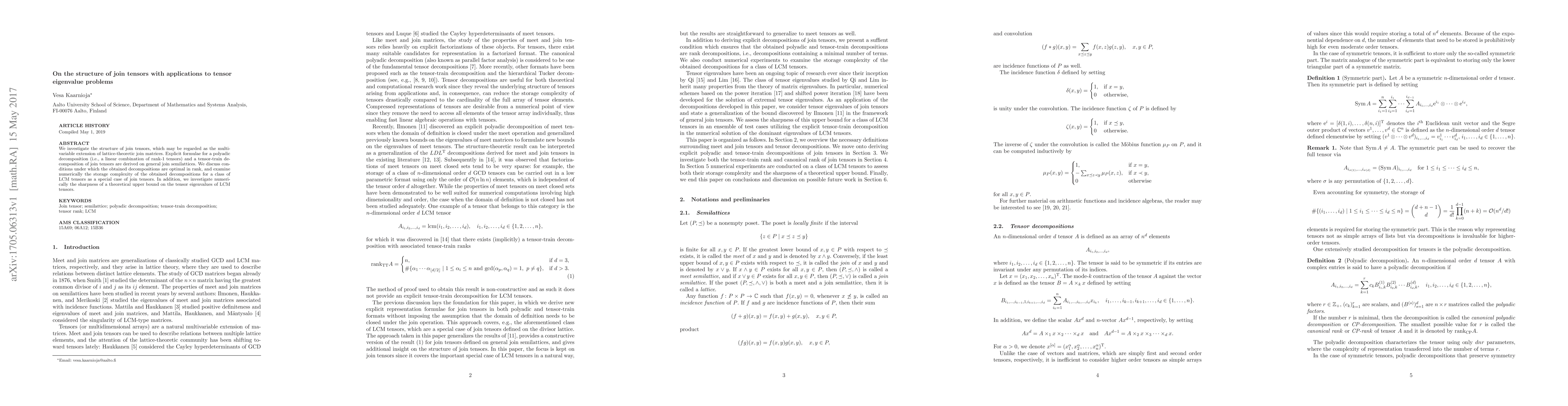 This paper explores the structure of join tensors, extending lattice-theoretic join matrices to multivariable tensors. It derives polyadic and tensor-train decompositions for join tensors and examines their optimality and storage complexity, focusing on LCM tensors. Additionally, it investigates the theoretical upper bound on tensor eigenvalues for LCM tensors.
