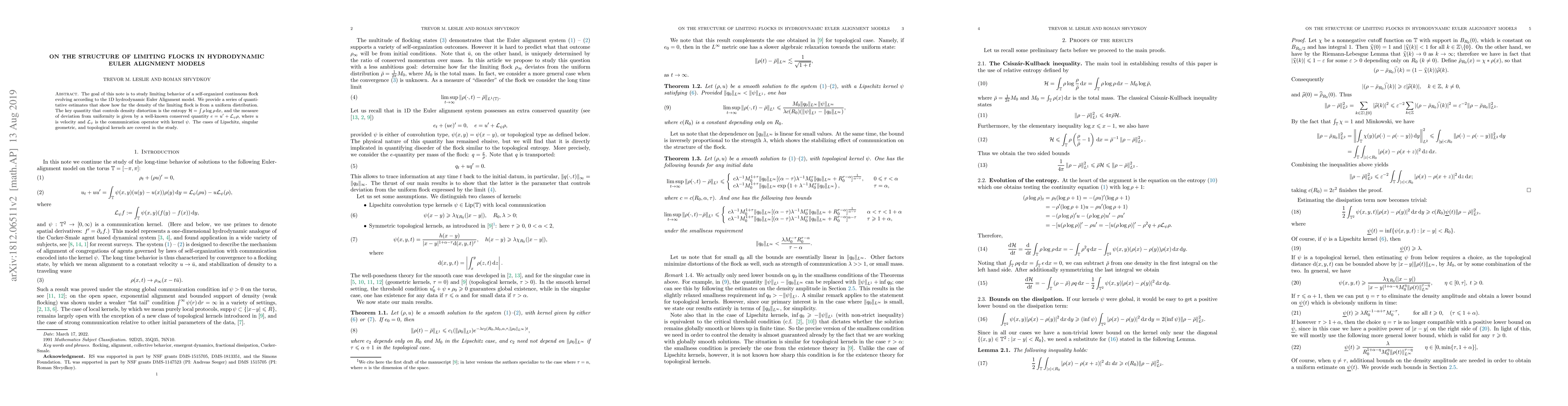 The goal of this note is to study limiting behavior of a self-organized continuous flock evolving according to the 1D hydrodynamic Euler Alignment model. We provide a series of quantitative estimates that show how far the density of the limiting flock is from a uniform distribution. The key quantity that controls density distortion is the entropy $\mathcal{H} = \int \rho \log \rho \,\mbox{d}x$, and the measure of deviation from uniformity is given by a well-known conserved quantity $e = u' + \mathcal{L}_\psi \rho$, where $u$ is velocity and $\mathcal{L}_\psi $ is the communication operator with kernel $\psi$. The cases of Lipschitz, singular geometric, and topological kernels are covered in the study.