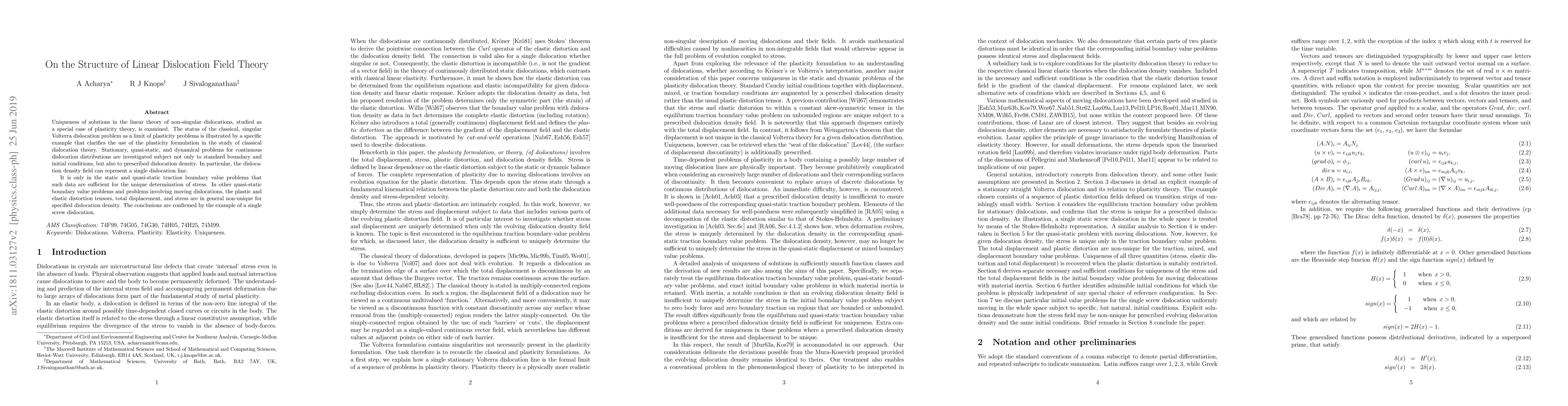 This paper examines the uniqueness of solutions in linear dislocation field theory within the context of plasticity, illustrating the classical Volterra dislocation problem as a limit of plasticity problems. It finds that while static and quasi-static traction problems allow unique stress determination, other quasi-static and dynamical problems involving moving dislocations generally result in non-unique solutions for stress, plastic distortion, and displacement.