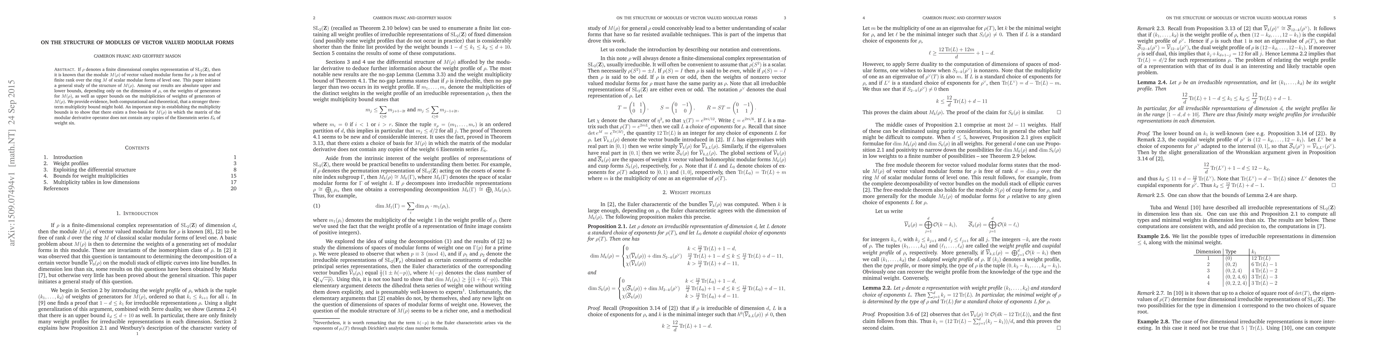 If $\rho$ denotes a finite dimensional complex representation of $\textbf{SL}_2(\textbf{Z})$, then it is known that the module $M(\rho)$ of vector valued modular forms for $\rho$ is free and of finite rank over the ring $M$ of scalar modular forms of level one. This paper initiates a general study of the structure of $M(\rho)$. Among our results are absolute upper and lower bounds, depending only on the dimension of $\rho$, on the weights of generators for $M(\rho)$, as well as upper bounds on the multiplicities of weights of generators of $M(\rho)$. We provide evidence, both computational and theoretical, that a stronger three-term multiplicity bound might hold. An important step in establishing the multiplicity bounds is to show that there exists a free-basis for $M(\rho)$ in which the matrix of the modular derivative operator does not contain any copies of the Eisenstein series $E_6$ of weight six.