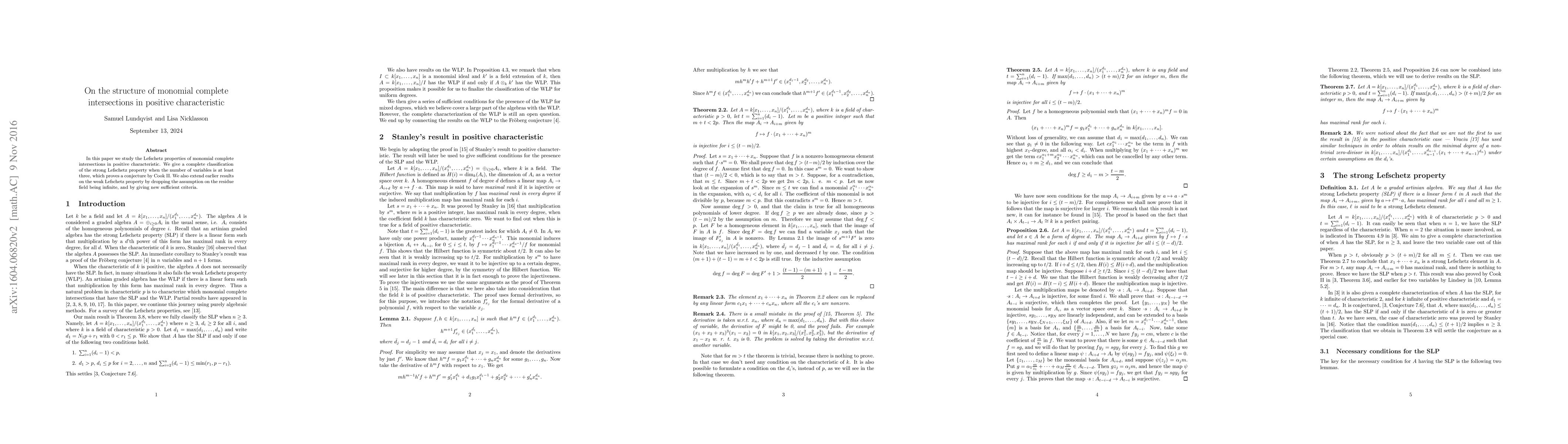 This paper classifies the strong Lefschetz property for monomial complete intersections in positive characteristic, proving a conjecture and extending prior work on the weak Lefschetz property by removing assumptions on the residue field and providing new criteria.