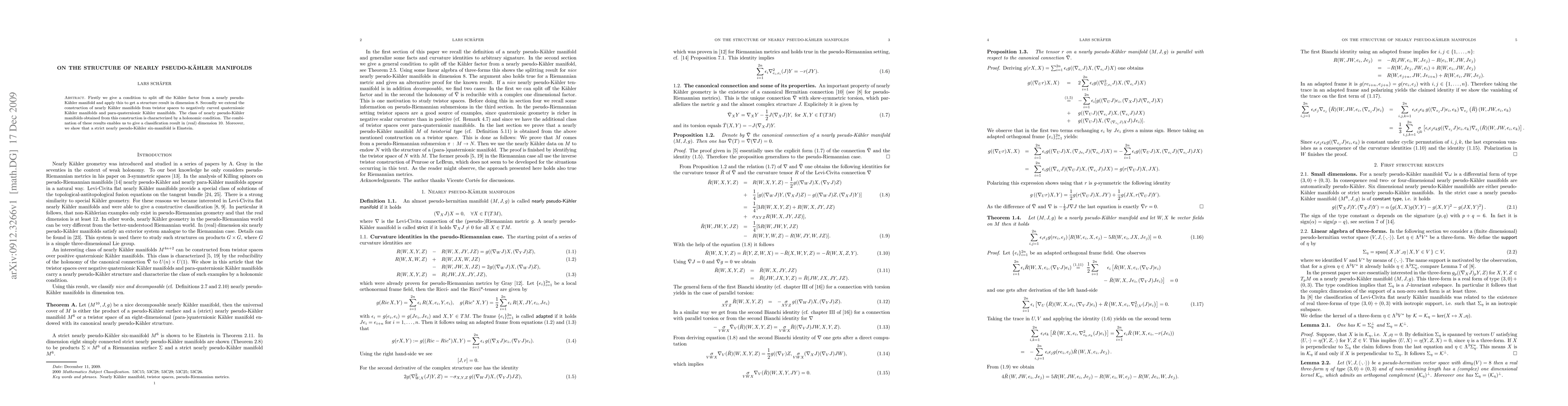 This paper develops conditions to isolate the Kähler factor from nearly pseudo-Kähler manifolds, leading to structural results in dimension 8. It extends nearly Kähler manifold constructions to negatively curved quaternionic and para-quaternionic Kähler manifolds, resulting in a classification in dimension 10 and proving that strict nearly pseudo-Kähler six-manifolds are Einstein.