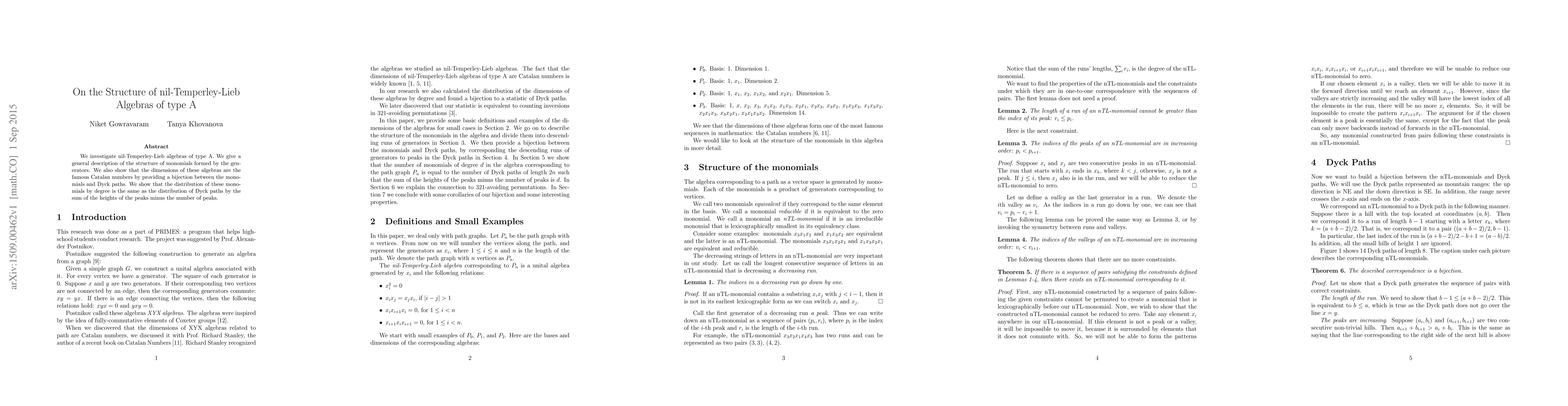 Summary: This paper explores nil-Temperley-Lieb algebras of type A, detailing the structure of their monomials and proving that their dimensions correspond to Catalan numbers through a bijection with Dyck paths, with degree distribution matching the sum of peak heights minus peaks in Dyck paths.