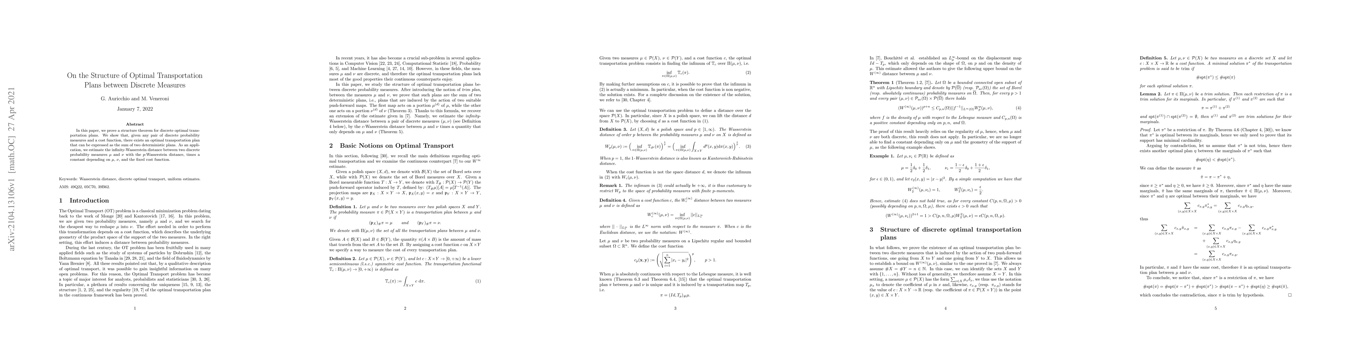 This paper proves a structure theorem for discrete optimal transportation plans, demonstrating that any optimal plan can be expressed as the sum of two deterministic plans. It also applies this result to estimate the infinity-Wasserstein distance using the $p$-Wasserstein distance, scaled by a constant dependent on the measures and cost function.