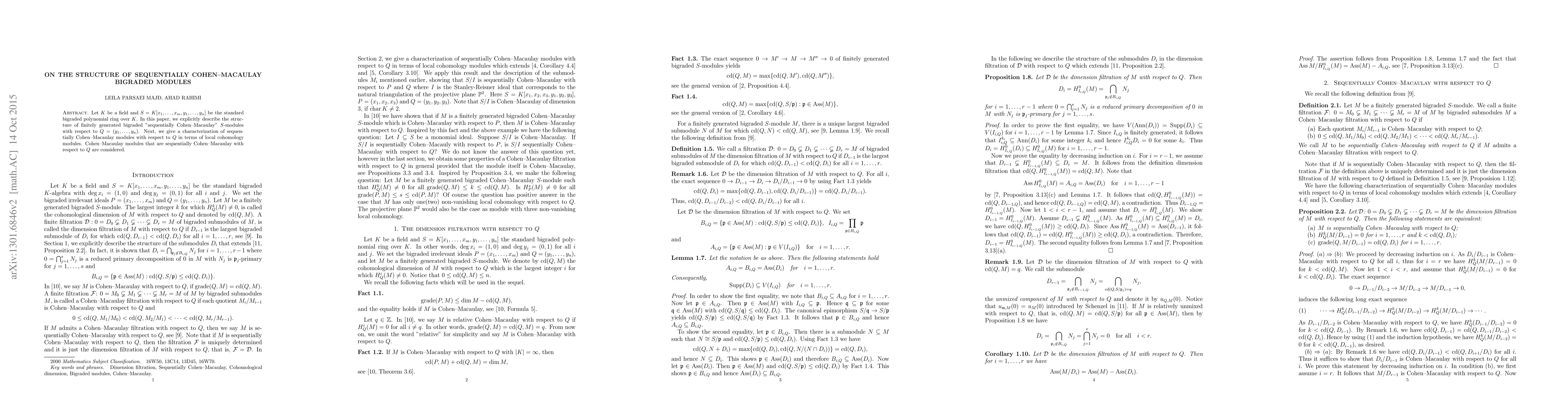 This paper characterizes the structure of finitely generated bigraded sequentially Cohen--Macaulay $S$-modules with respect to $Q=(y_1,\ldots,y_n)$ and provides a local cohomology-based characterization of such modules. It also examines Cohen--Macaulay modules that maintain sequentially Cohen--Macaulay properties.