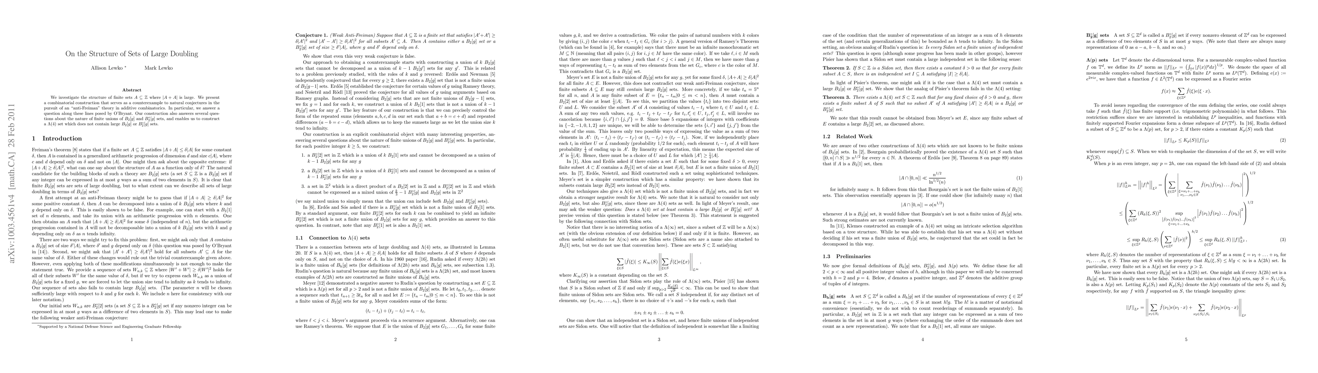 We investigate the structure of finite sets $A \subseteq \Z$ where $|A+A|$ is large. We present a combinatorial construction that serves as a counterexample to natural conjectures in the pursuit of an "anti-Freiman" theory in additive combinatorics. In particular, we answer a question along these lines posed by O'Bryant. Our construction also answers several questions about the nature of finite unions of $B_2[g]$ and $B^\circ_2[g]$ sets, and enables us to construct a $\Lambda(4)$ set which does not contain large $B_2[g]$ or $B^\circ_2[g]$ sets.
