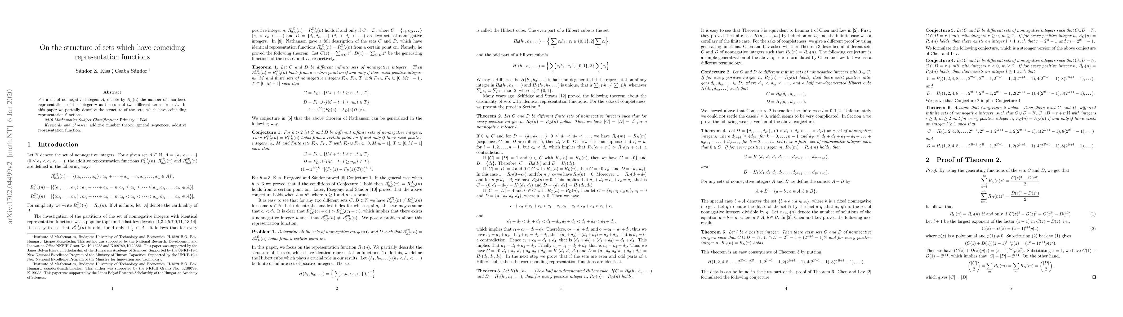 This paper investigates the structure of sets of nonnegative integers where the representation functions, counting the number of ways to sum two distinct elements from the set to form a given integer, are identical. It provides partial insights into the characteristics of such sets.