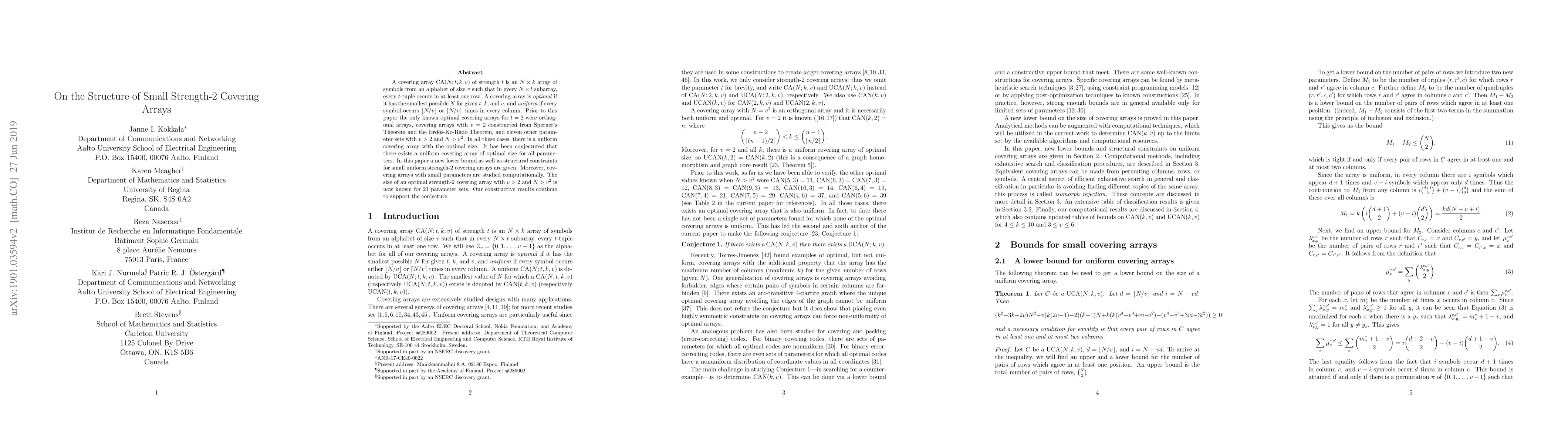 A covering array $\rm{CA}(N;t,k,v)$ of strength $t$ is an $N \times k$ array of symbols from an alphabet of size $v$ such that in every $N \times t$ subarray, every $t$-tuple occurs in at least one row. A covering array is \emph{optimal} if it has the smallest possible $N$ for given $t$, $k$, and $v$, and \emph{uniform} if every symbol occurs $\lfloor N/v \rfloor$ or $\lceil N/v \rceil$ times in every column. Prior to this paper the only known optimal covering arrays for $t=2$ were orthogonal arrays, covering arrays with $v=2$ constructed from Sperner's Theorem and the Erd\H{o}s-Ko-Rado Theorem, and eleven other parameter sets with $v>2$ and $N > v^2$. In all these cases, there is a uniform covering array with the optimal size. It has been conjectured that there exists a uniform covering array of optimal size for all parameters. In this paper a new lower bound as well as structural constraints for small uniform strength-$2$ covering arrays are given. Moreover, covering arrays with small parameters are studied computationally. The size of an optimal strength-$2$ covering array with $v > 2$ and $N > v^2$ is now known for $21$ parameter sets. Our constructive results continue to support the conjecture.