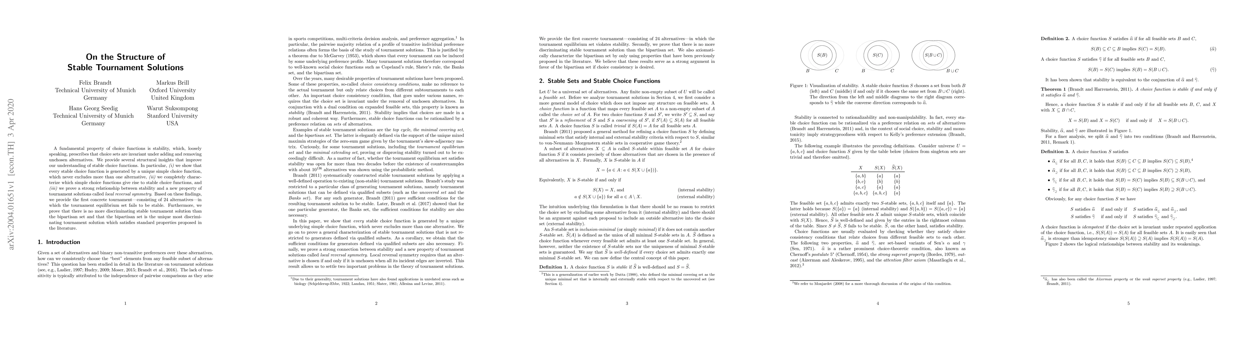 This paper explores the structural properties of stable choice functions, demonstrating that every stable choice function is derived from a unique simple choice function. It characterizes the conditions under which simple choice functions produce stable functions and establishes a link between stability and local reversal symmetry. The study also identifies a tournament with 24 alternatives where the equilibrium set is not stable and proves that the bipartisan set is the most discriminating stable tournament solution.