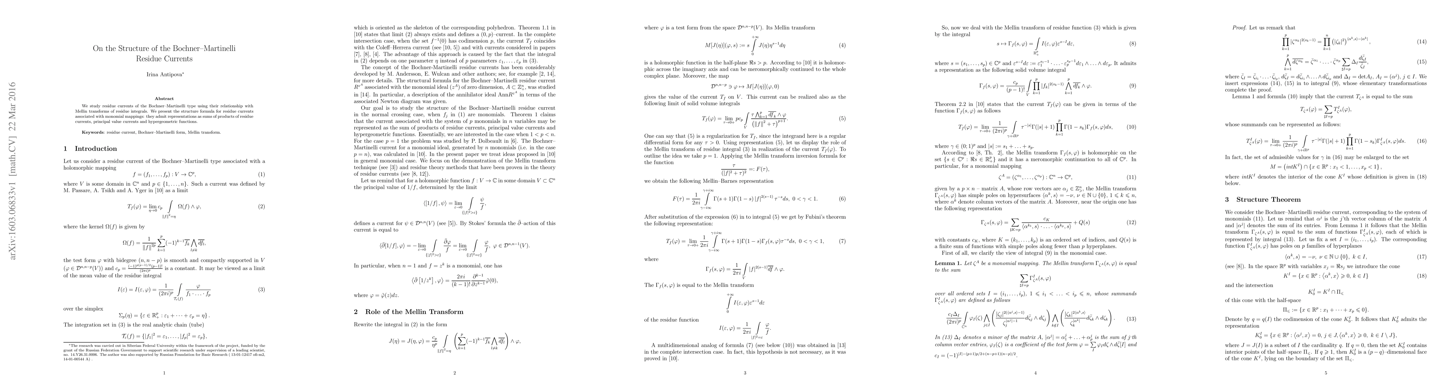 This paper investigates Bochner-Martinelli residue currents through their connection with Mellin transforms of residue integrals, presenting a structural formula that expresses these currents as combinations of residue currents, principal value currents, and hypergeometric functions for monomial mappings.
