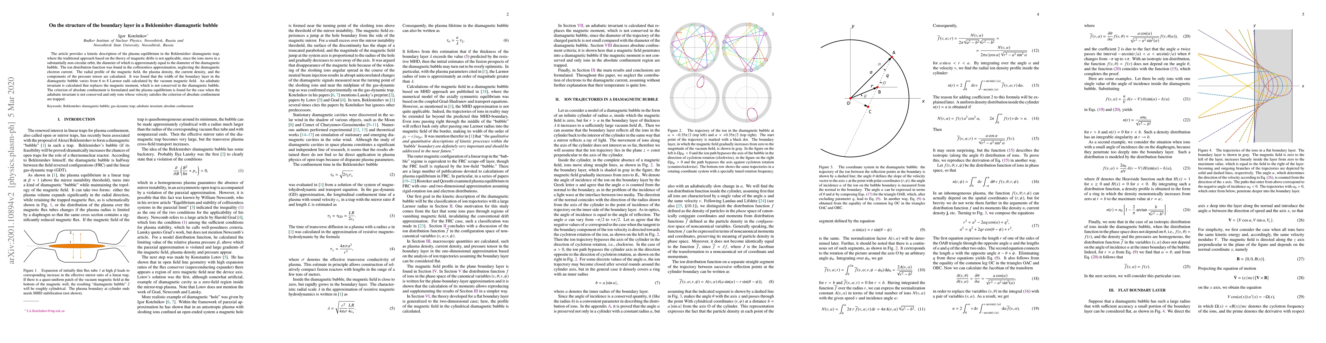 This paper presents a kinetic analysis of plasma equilibrium in a Beklemishev diamagnetic trap, revealing that ions follow non-circular orbits. It calculates the boundary layer width, which ranges from 6 to 8 Larmor radii, and formulates a criterion for absolute confinement based on an adiabatic invariant.