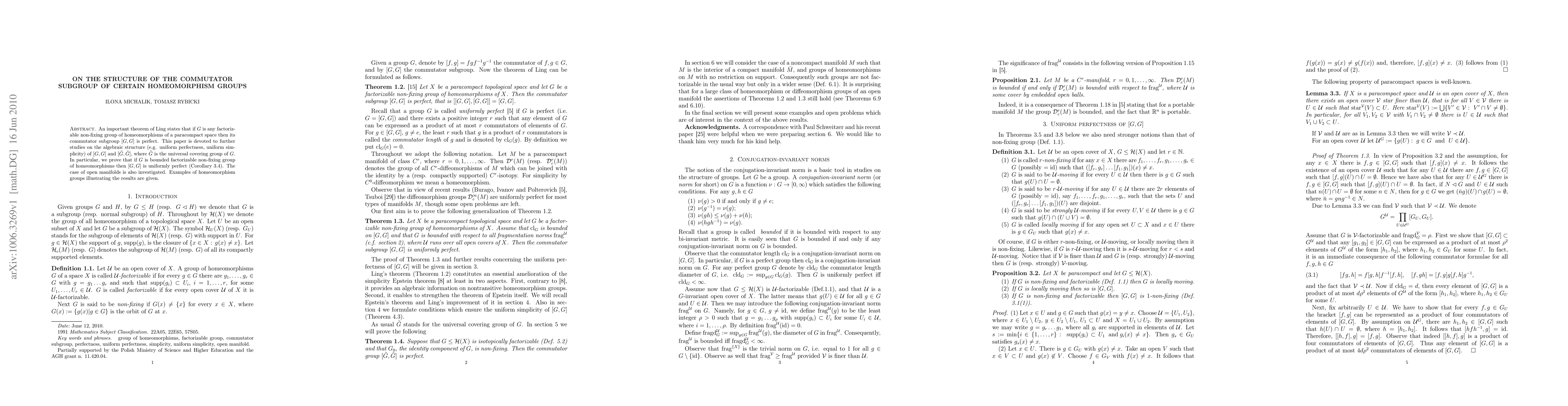 An important theorem of Ling states that if $G$ is any factorizable non-fixing group of homeomorphisms of a paracompact space then its commutator subgroup $[G,G]$ is perfect. This paper is devoted to further studies on the algebraic structure (e.g. uniform perfectness, uniform simplicity) of $[G,G]$ and $[\tilde G,\tilde G]$, where $\tilde G$ is the universal covering group of $G$. In particular, we prove that if $G$ is bounded factorizable non-fixing group of homeomorphisms then $[G,G]$ is uniformly perfect (Corollary 3.4). The case of open manifolds is also investigated. Examples of homeomorphism groups illustrating the results are given.