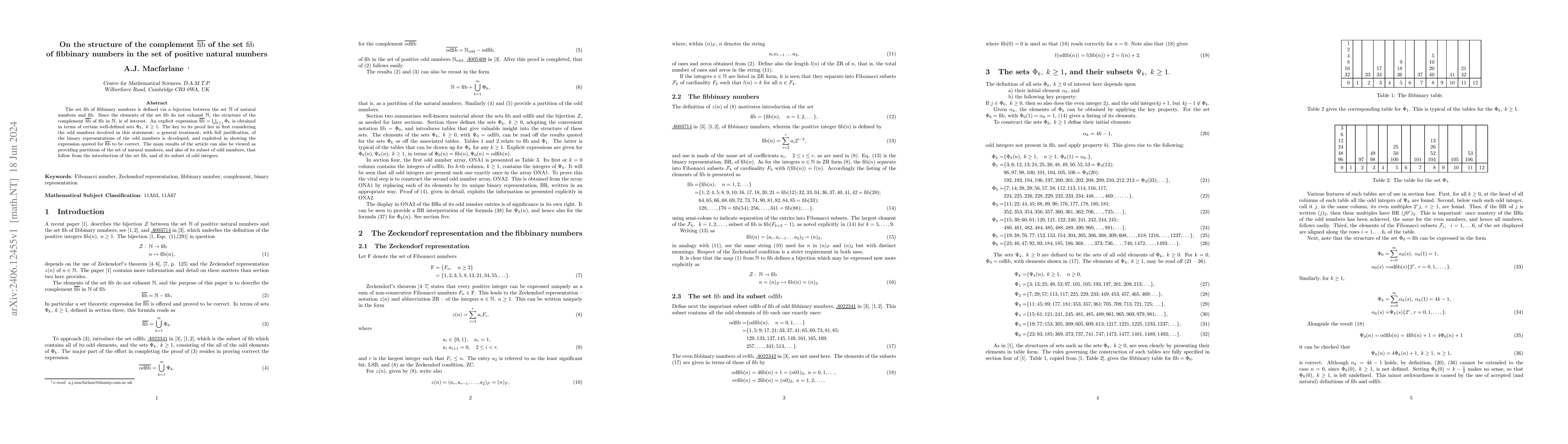 The set $\Mfib$ of fibbinary numbers is defined via a bijection between the set $\BB{N}$ of natural numbers and $\Mfib$. Since the elements of $\Mfib$ do not exhaust $\BB{N}$, the structure of the complement $\overline{\Mfib}$ of $\Mfib$ in $\BB{N}$ is of interest. An explicit expression $\overline{\Mfib}=\bigcup_{k \geq 1}^\infty \Phi_k$ is obtained in terms of certain well-defined sets $\Phi_k, \; k \geq 1$. The key to its proof lies in first considering the odd numbers involved in this statement: a general treatment, with full justification, of the binary representations of the odd numbers is developed, and exploited in showing the expression quoted for $\overline{\Mfib}$ to be correct. The main results of the article can also be viewed as providing partitions of the set $\BB{N}$ of natural numbers, and also of its subset of odd numbers, that follow from the introduction of the set $\Mfib$, and of its subset of odd integers.