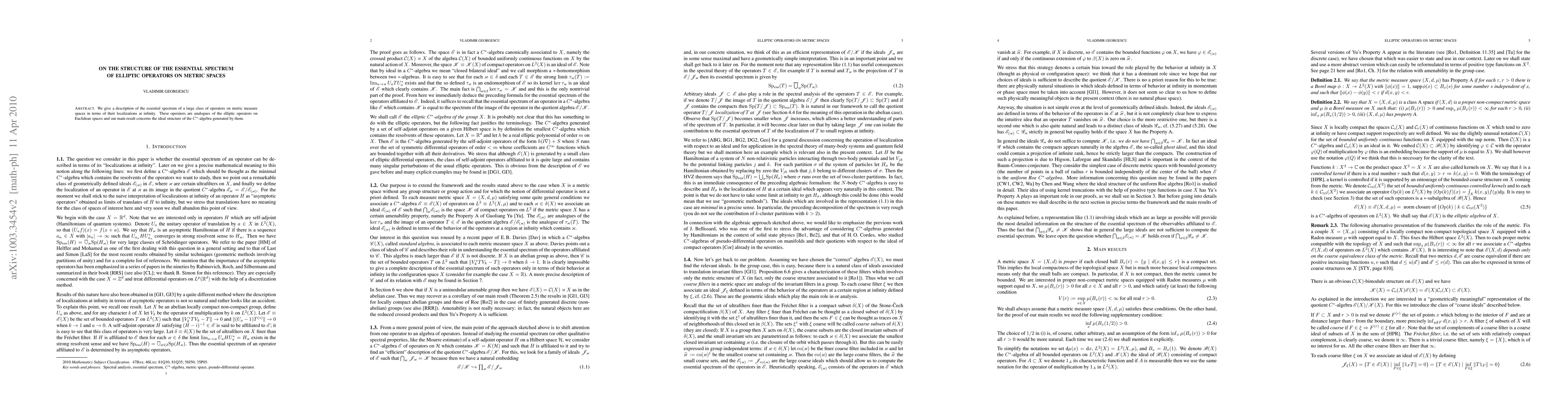 Summary: This paper describes the essential spectrum of elliptic operators on metric measure spaces, relating it to localizations at infinity, and explores the ideal structure of the $C^*$-algebra generated by these operators.