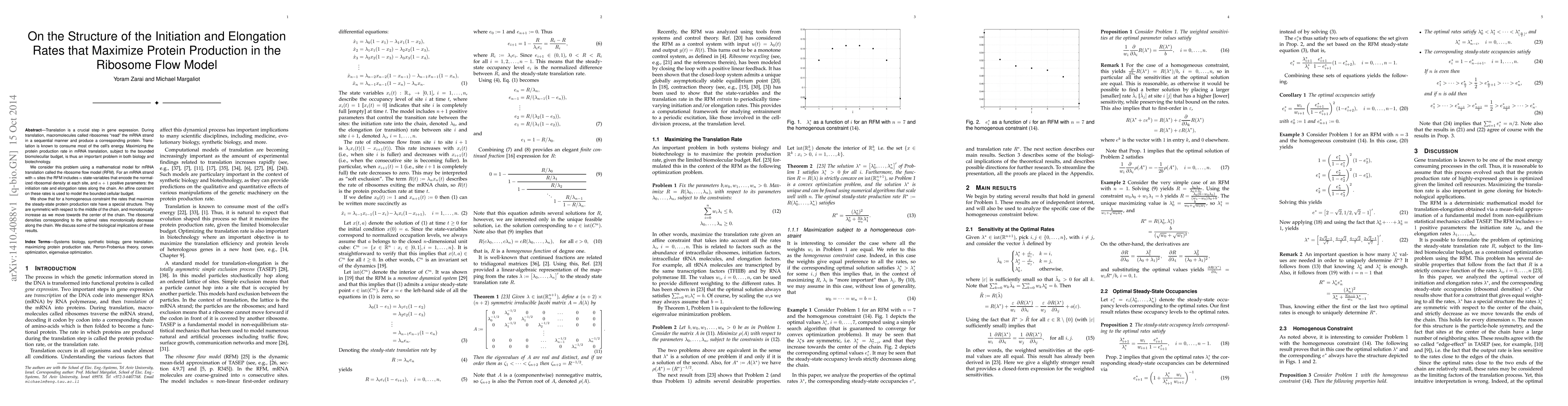 This paper uses the ribosome flow model to analyze how initiation and elongation rates can be optimized to maximize protein production during translation, under the constraint of a bounded cellular budget. It finds that the optimal rates exhibit a symmetric, increasing pattern towards the center of the mRNA strand, with corresponding ribosomal densities decreasing monotonically.