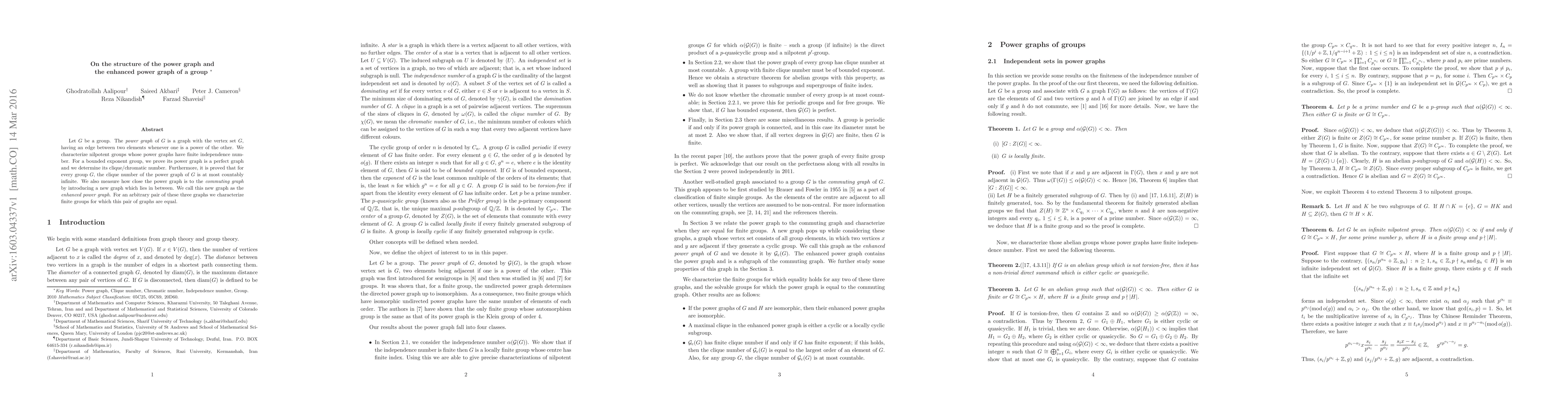 This paper characterizes nilpotent groups with finite independence number in their power graphs, proves that the power graph of a bounded exponent group is perfect, and determines its clique/chromatic number. It also introduces the enhanced power graph and identifies finite groups where the power graph and enhanced power graph coincide.