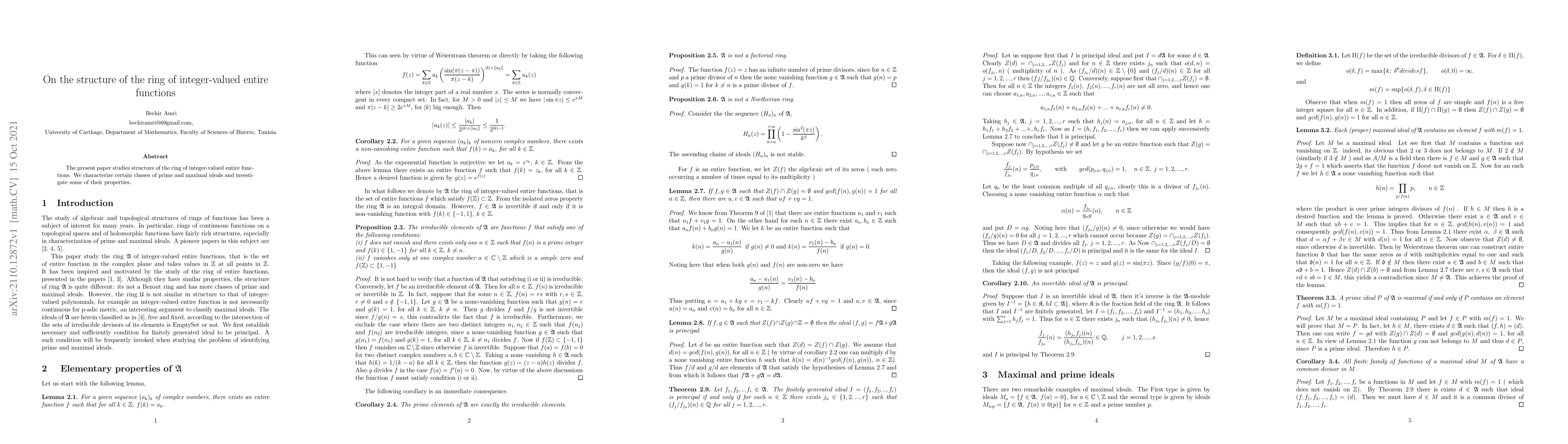 This paper explores the structure of the ring of integer-valued entire functions, characterizing specific prime and maximal ideals and examining their properties. The study aims to deepen the understanding of the algebraic and analytic nature of these functions.