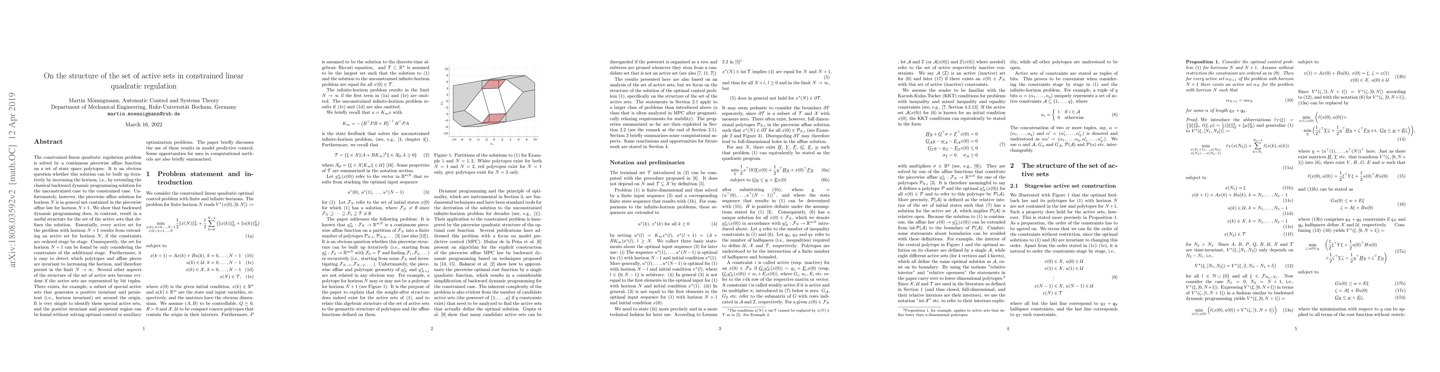 The paper shows that using backward dynamic programming for constrained linear quadratic regulation problems can reveal a useful structure for the set of active sets, which persists even when increasing the horizon. This allows for efficient identification of invariant regions around the origin.
