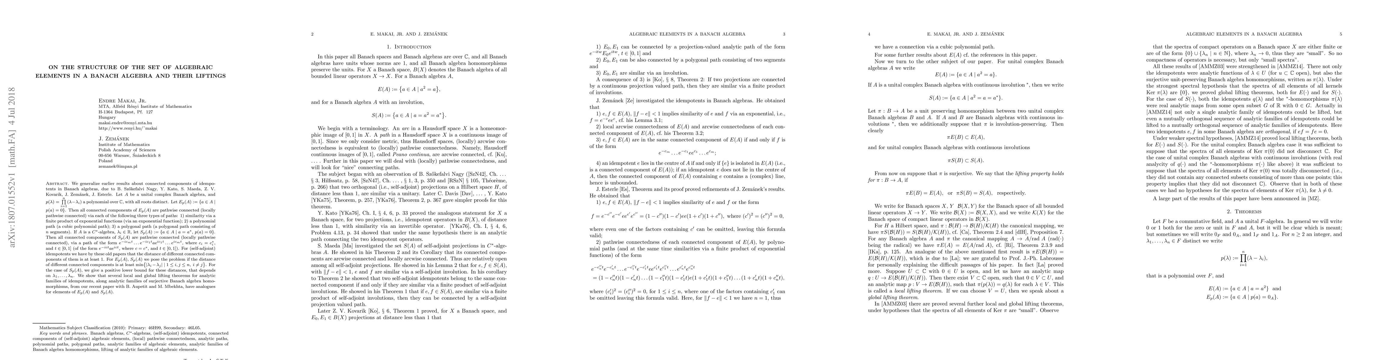 We generalize earlier results about connected components of idempotents in Banach algebras, due to B. Sz\H{o}kefalvi Nagy, Y. Kato, S. Maeda, Z. V. Kovarik, J. Zem\'anek, J. Esterle. Let $A$ be a unital complex Banach algebra, and $p(\lambda) = \prod\limits_{i = 1}^n (\lambda - \lambda_i)$ a polynomial over $\Bbb C$, with all roots distinct. Let $E_p(A) := \{a \in A \mid p(a) = 0\}$. Then all connected components of $E_p(A)$ are pathwise connected (locally pathwise connected) via each of the following three types of paths: 1)~similarity via a finite product of exponential functions (via an exponential function); 2)~a polynomial path (a cubic polynomial path); 3)~a polygonal path (a polygonal path consisting of $n$ segments). If $A$ is a $C^*$-algebra, $\lambda_i \in \Bbb R$, let $S_p(A):= \{a\in A \mid a = a^*$, $p(a) = 0\}$. Then all connected components of $S_p(A)$ are pathwise connected (locally pathwise connected), via a path of the form $e^{-ic_mt}\dots e^{-ic_1t} ae^{ic_1t}\dots e^{ic_mt}$, where $c_i = c_i^*$, and $t \in [0, 1]$ (of the form $e^{-ict} ae^{ict}$, where $c = c^*$, and $t \in [0,1]$). For (self-adjoint) idempotents we have by these old papers that the distance of different connected components of them is at least~$1$. For $E_p(A)$, $S_p(A)$ we pose the problem if the distance of different connected components is at least $\min \bigl\{|\lambda_i - \lambda_j| \mid 1 \leq i,j \leq n, \ i \neq j\bigr\}$. For the case of $S_p(A)$, we give a positive lower bound for these distances, that depends on $\lambda_1, \dots, \lambda_n$. We show that several local and global lifting theorems for analytic families of idempotents, along analytic families of surjective Banach algebra homomorphisms, from our recent paper with B. Aupetit and M. Mbekhta, have analogues for elements of $E_p(A)$ and $S_p(A)$.