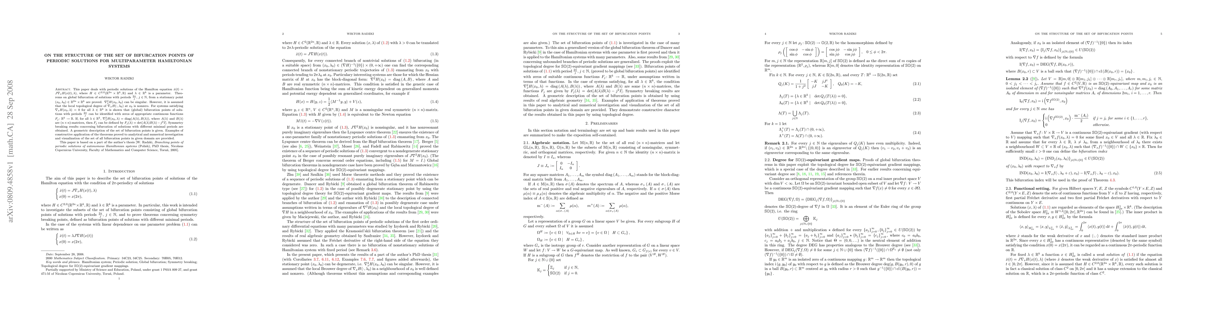 This paper investigates the global bifurcation of periodic solutions in multiparameter Hamiltonian systems, proving theorems that identify bifurcation points with zeros of continuous functions. It provides explicit formulae and a geometric description of these points, with applications to analytical and numerical investigations.