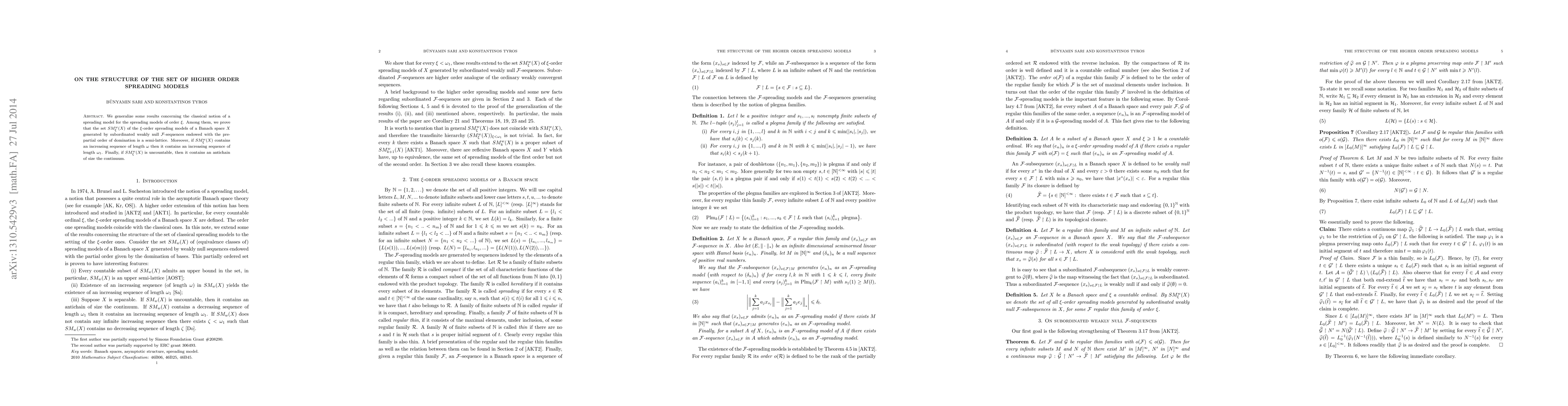 We generalize some results concerning the classical notion of a spreading model for the spreading models of order $\xi$. Among them, we prove that the set $SM_\xi^w(X)$ of the $\xi$-order spreading models of a Banach space $X$ generated by subordinated weakly null $\mathcal{F}$-sequences endowed with the pre-partial order of domination is a semi-lattice. Moreover, if $SM_\xi^w(X)$ contains an increasing sequence of length $\omega$ then it contains an increasing sequence of length $\omega_1$. Finally, if $SM_\xi^w(X)$ is uncountable, then it contains an antichain of size the continuum.
