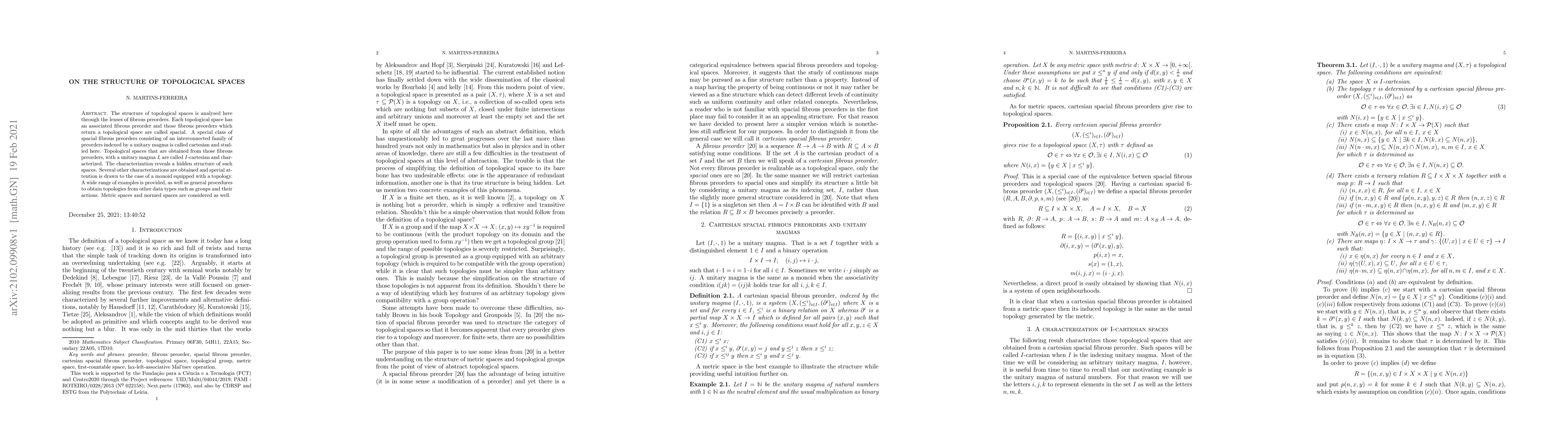 The structure of topological spaces is analysed here through the lenses of fibrous preorders. Each topological space has an associated fibrous preorder and those fibrous preorders which return a topological space are called spacial. A special class of spacial fibrous preorders consisting of an interconnected family of preorders indexed by a unitary magma is called cartesian and studied here. Topological spaces that are obtained from those fibrous preorders, with a unitary magma \emph{I}, are called \emph{I}-cartesian and characterized. The characterization reveals a hidden structure of such spaces. Several other characterizations are obtained and special attention is drawn to the case of a monoid equipped with a topology. A wide range of examples is provided, as well as general procedures to obtain topologies from other data types such as groups and their actions. Metric spaces and normed spaces are considered as well.