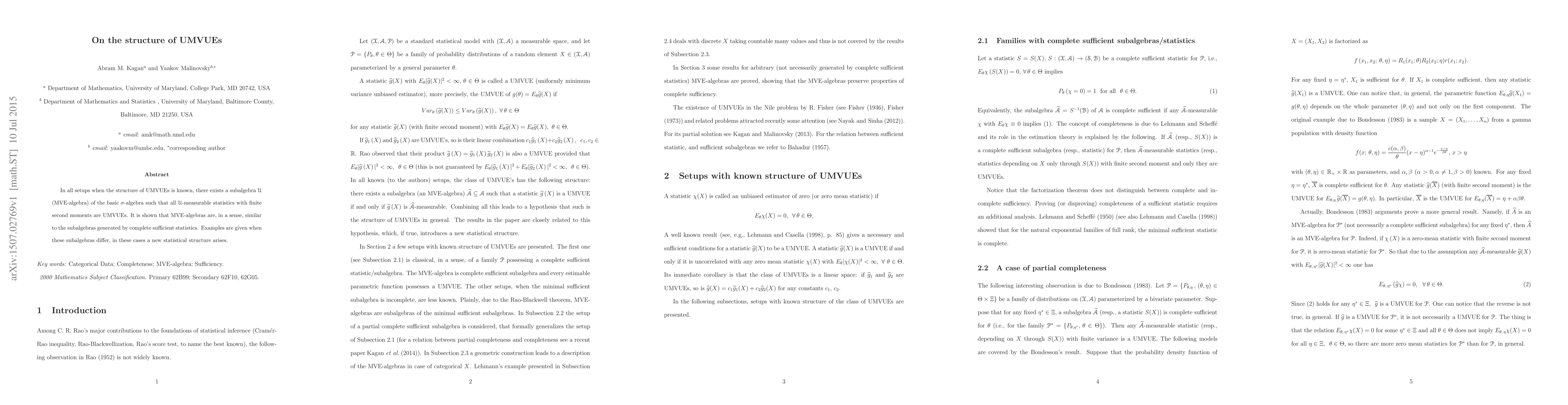 In all setups when the structure of UMVUEs is known, there exists a subalgebra $\cal U$ (MVE-algebra) of the basic $\sigma$-algebra such that all $\cal U$-measurable statistics with finite second moments are UMVUEs. It is shown that MVE-algebras are, in a sense, similar to the subalgebras generated by complete sufficient statistics. Examples are given when these subalgebras differ, in these cases a new statistical structure arises.
