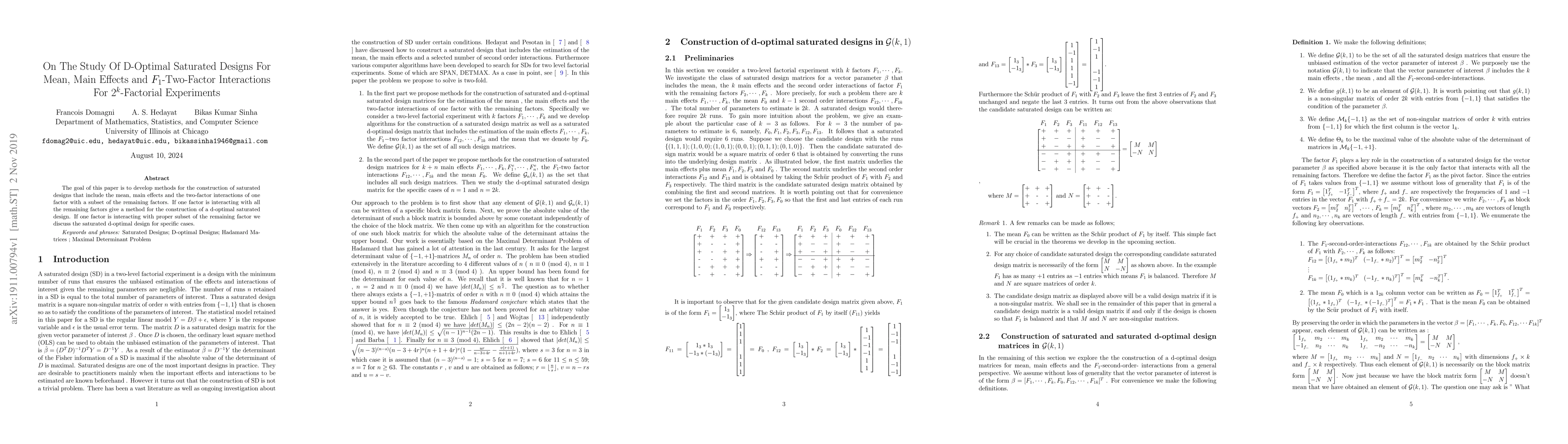 This paper develops methods for constructing saturated d-optimal designs for $2^k$-factorial experiments, focusing on mean, main effects, and $F_1$-two-factor interactions. It provides specific techniques for cases where one factor interacts with all or a proper subset of the remaining factors.