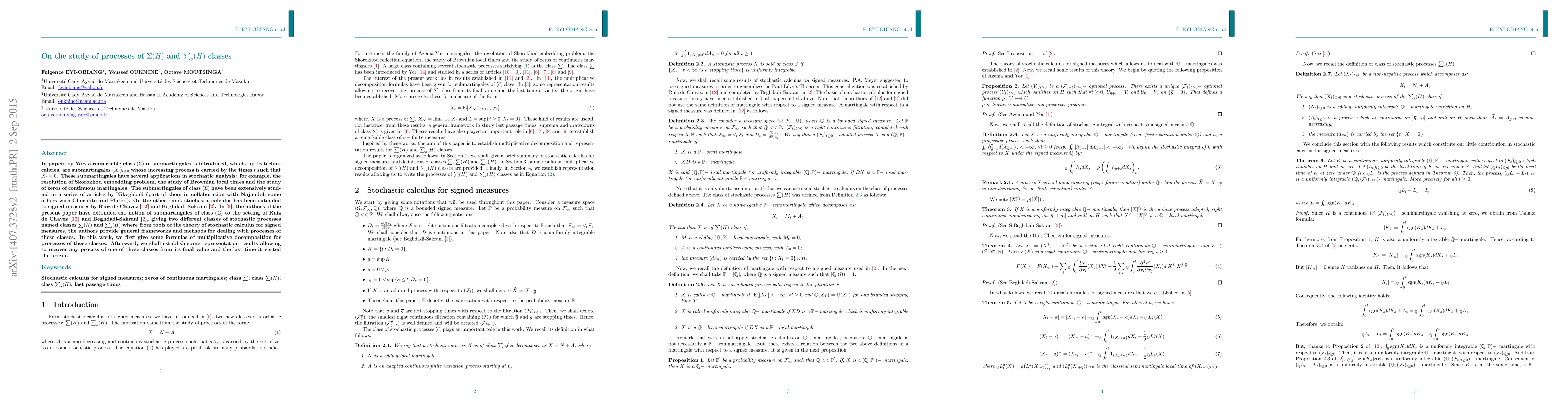 In papers by Yor, a remarkable class $(\Sigma)$ of submartingales is introduced, which, up to technicalities, are submartingales $(X_{t})_{t\geq0}$ whose increasing process is carried by the times $t$ such that $X_{t}=0$. These submartingales have several applications in stochastic analysis: for example, the resolution of Skorokhod embedding problem, the study of Brownian local times and the study of zeros of continuous martingales. The submartingales of class $(\Sigma)$ have been extensively studied in a series of articles by Nikeghbali (part of them in collaboration with Najnudel, some others with Cheridito and Platen). On the other hand, stochastic calculus has been extended to signed measures by Ruiz de Chavez \cite{chav} and Beghdadi-Sakrani \cite{sak}. In \cite{f}, the authors of the present paper have extended the notion of submartingales of class $(\Sigma)$ to the setting of Ruiz de Chavez \cite{chav} and Beghdadi-Sakrani \cite{sak}, giving two different classes of stochastic processes named classes $\sum(H)$ and $\sum_{s}(H)$ where from tools of the theory of stochastic calculus for signed measures, the authors provide general frameworks and methods for dealing with processes of these classes. In this work, we first give some formulas of multiplicative decomposition for processes of these classes. Afterward, we shall establish some representation results allowing to recover any process of one of these classes from its final value and the last time it visited the origin.