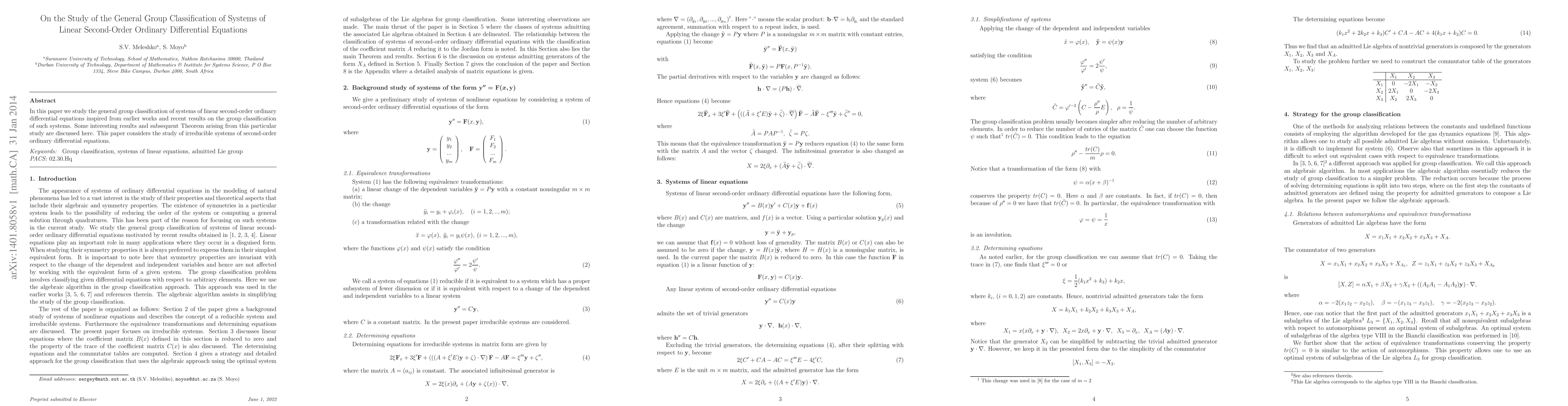 This paper investigates the general group classification of irreducible systems of linear second-order ordinary differential equations, building on prior research and presenting new theorems and findings in this area. The study highlights significant results derived from the classification process.