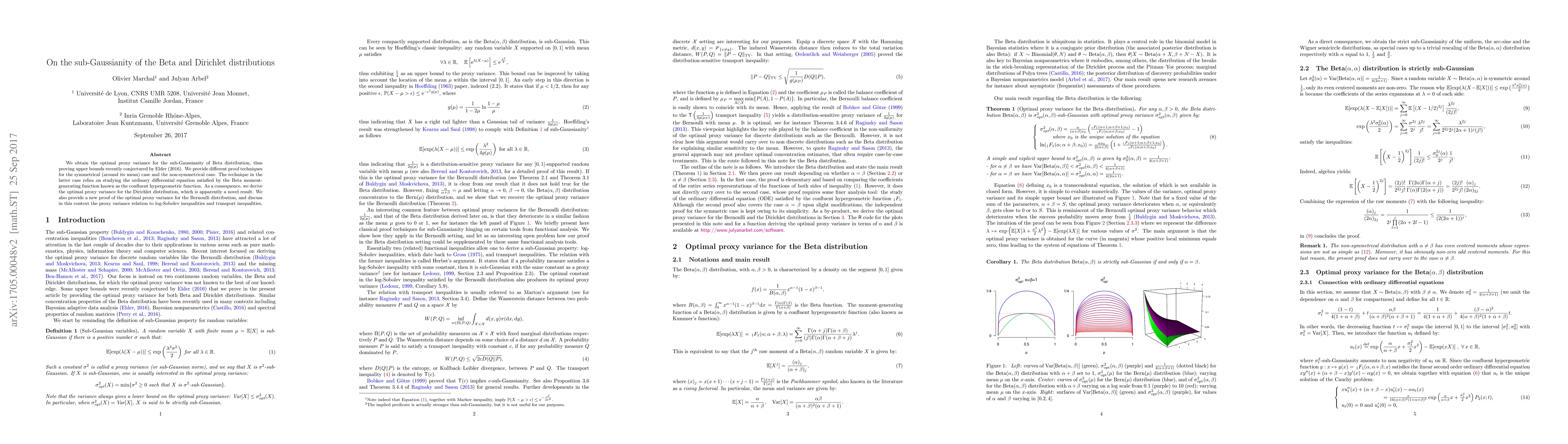 We obtain the optimal proxy variance for the sub-Gaussianity of Beta distribution, thus proving upper bounds recently conjectured by Elder (2016). We provide different proof techniques for the symmetrical (around its mean) case and the non-symmetrical case. The technique in the latter case relies on studying the ordinary differential equation satisfied by the Beta moment-generating function known as the confluent hypergeometric function. As a consequence, we derive the optimal proxy variance for the Dirichlet distribution, which is apparently a novel result. We also provide a new proof of the optimal proxy variance for the Bernoulli distribution, and discuss in this context the proxy variance relation to log-Sobolev inequalities and transport inequalities.