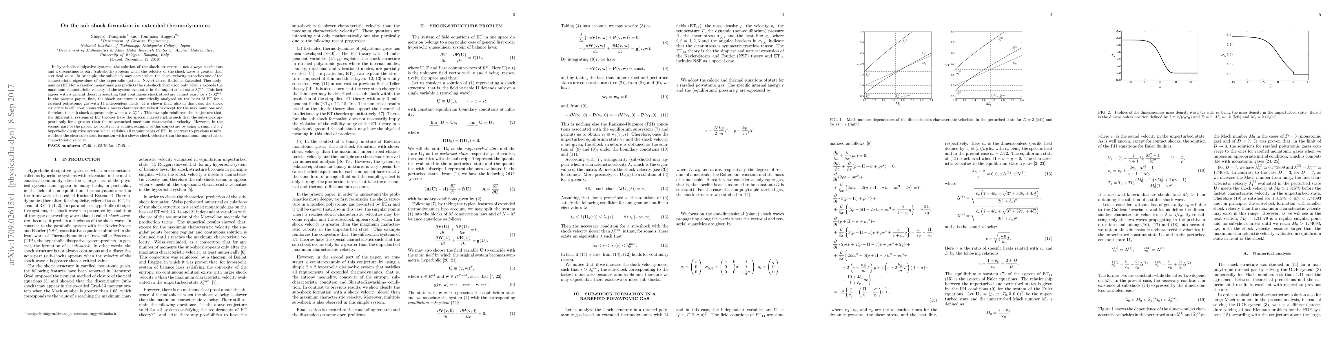 In hyperbolic dissipative systems, the solution of the shock structure is not always continuous and a discontinuous part (sub-shock) appears when the velocity of the shock wave is greater than a critical value. In principle, the sub-shock may occur when the shock velocity $s$ reaches one of the characteristic eigenvalues of the hyperbolic system. Nevertheless, Rational Extended Thermodynamics (ET) for a rarefied monatomic gas predicts the sub-shock formation only when $s$ exceeds the maximum characteristic velocity of the system evaluated in the unperturbed state $\lambda^{\max}_0$. This fact agrees with a general theorem asserting that continuous shock structure cannot exist for $s >\lambda^{\max}_0 $. In the present paper, first, the shock structure is numerically analyzed on the basis of ET for a rarefied polyatomic gas with $14$ independent fields. It is shown that, also in this case, the shock structure is still continuous when $s$ meets characteristic velocities except for the maximum one and therefore the sub-shock appears only when $s >\lambda^{\max}_0 $. This example reinforces the conjecture that, the differential systems of ET theories have the special characteristics such that the sub-shock appears only for $s$ greater than the unperturbed maximum characteristic velocity. However, in the second part of the paper, we construct a counterexample of this conjecture by using a simple $2 \times 2$ hyperbolic dissipative system which satisfies all requirements of ET. In contrast to previous results, we show the clear sub-shock formation with a slower shock velocity than the maximum unperturbed characteristic velocity.