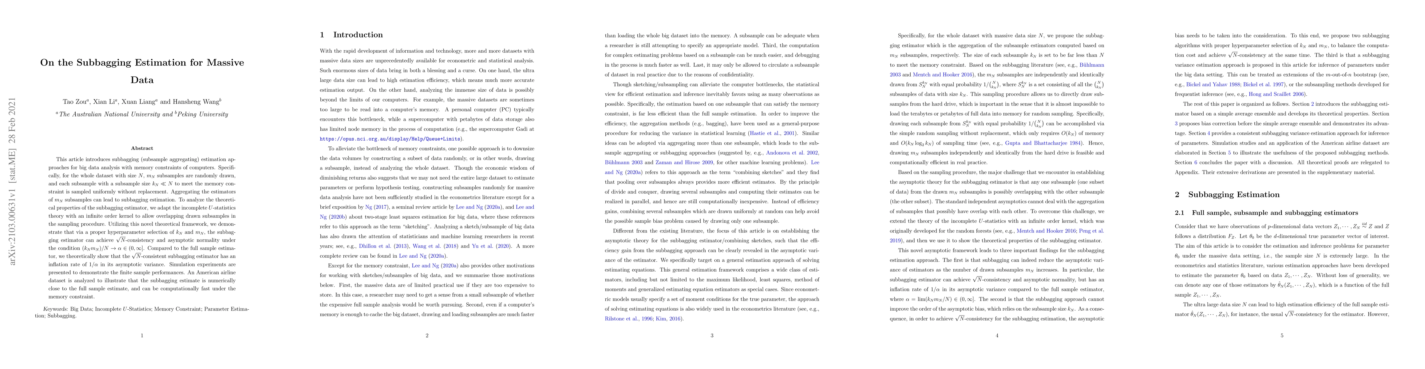 The subbagging estimation approach achieves $ extit{\sqrt{N}}$-consistency and asymptotic normality for massive data with memory constraints, outperforming the full sample estimator in terms of computational speed, and has a finite inflation rate in its asymptotic variance.