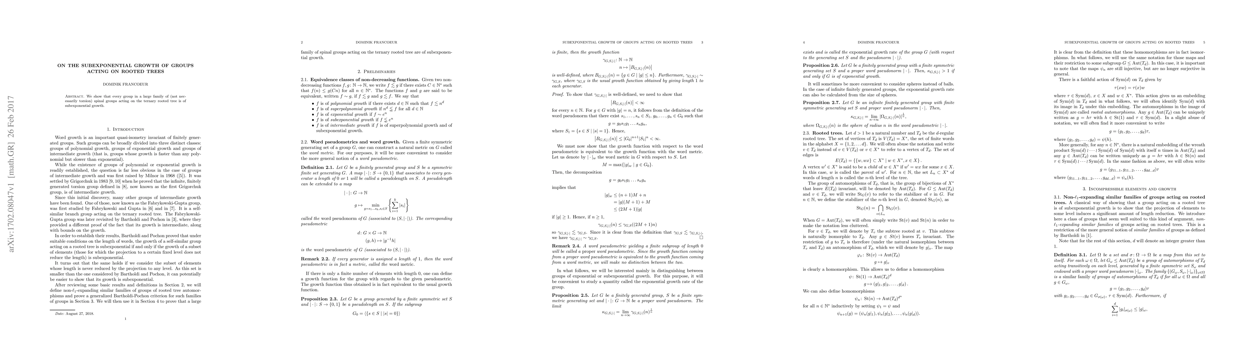 Summary: The paper demonstrates that groups within a broad category of spinal groups, acting on a ternary rooted tree, exhibit subexponential growth, regardless of whether they contain torsion elements. This establishes a significant growth rate property for these groups.