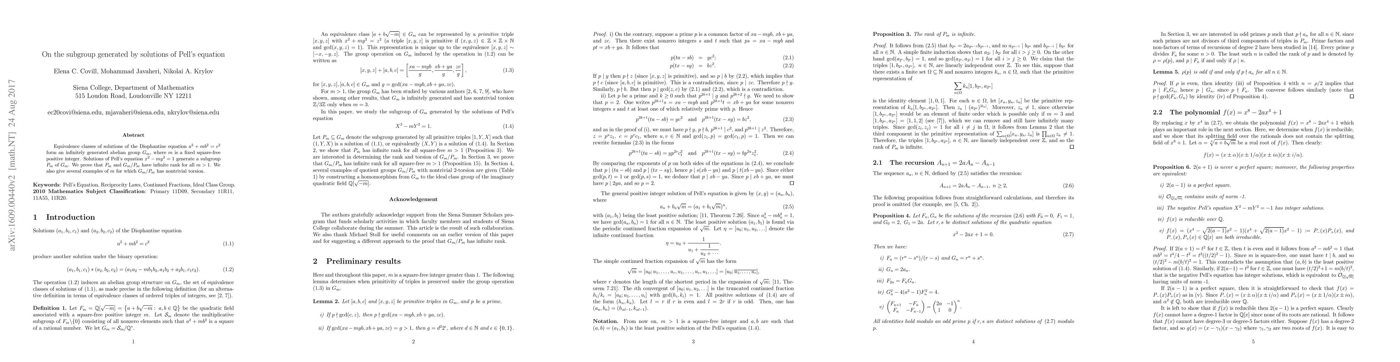 Equivalence classes of solutions of the Diophantine equation $a^2+mb^2=c^2$ form an infinitely generated abelian group $G_m$, where $m$ is a fixed square-free positive integer. Solutions of Pell's equation $x^2-my^2=1$ generate a subgroup $P_m$ of $G_m$. We prove that $P_m$ and $G_m/P_m$ have infinite rank for all $m>1$. We also give several examples of $m$ for which $G_m/P_m$ has nontrivial torsion.