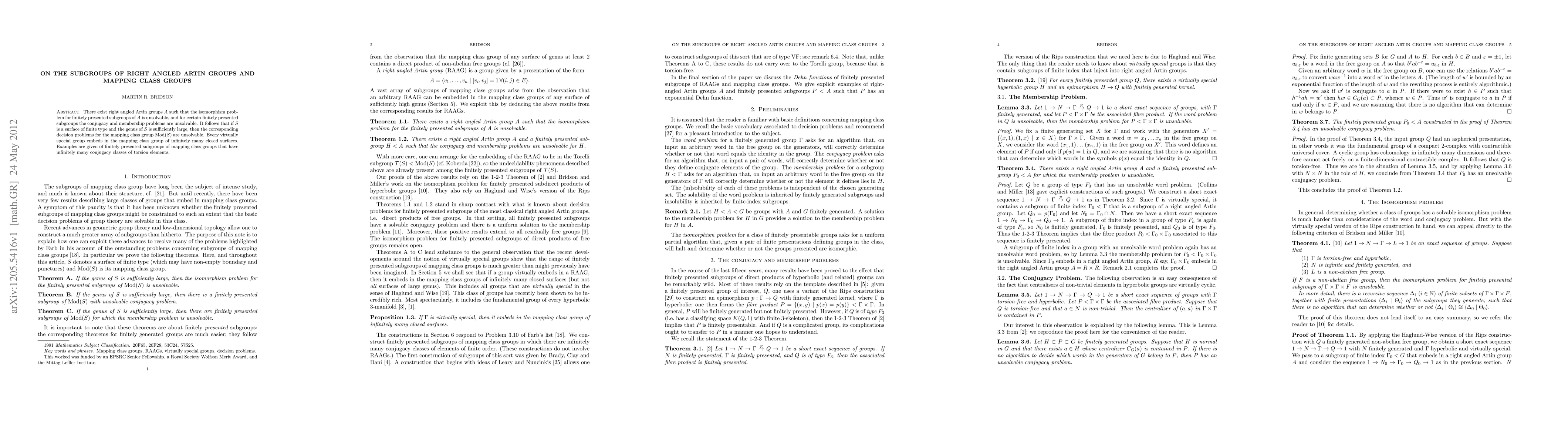 The paper discusses the unsolvability of decision problems for finitely presented subgroups in right angled Artin groups and mapping class groups, and shows that virtually special groups embed in the mapping class group of infinitely many surfaces. It also presents examples of subgroups with infinitely many conjugacy classes of torsion elements.