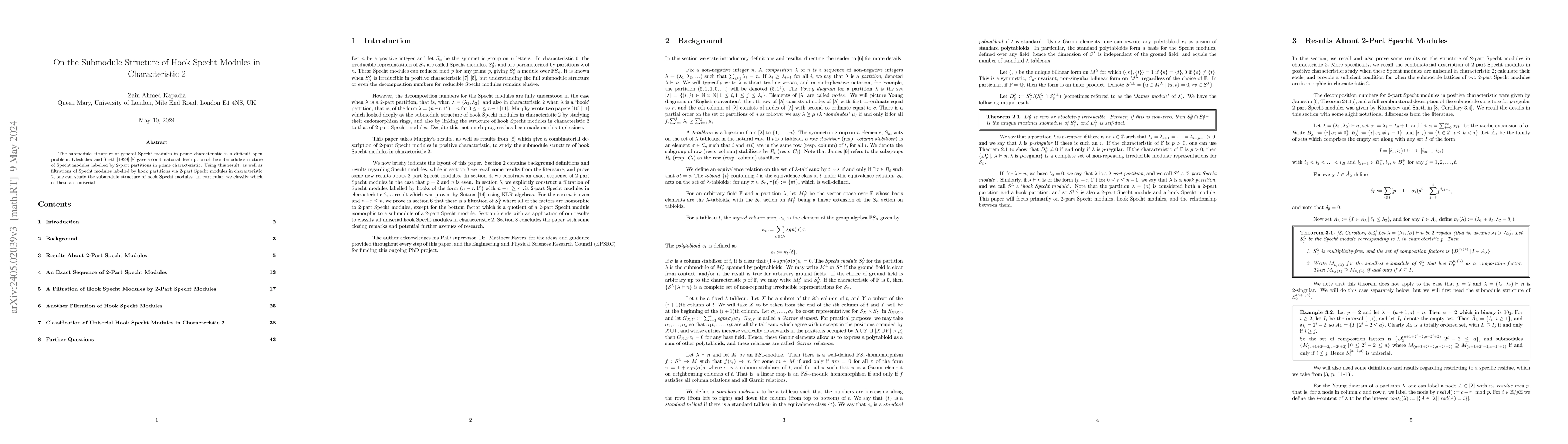 This paper classifies the uniserial submodule structure of hook Specht modules in characteristic 2, building on combinatorial results from Kleshchev and Sheth for $2$-part partitions and filtrations through $2$-part Specht modules.