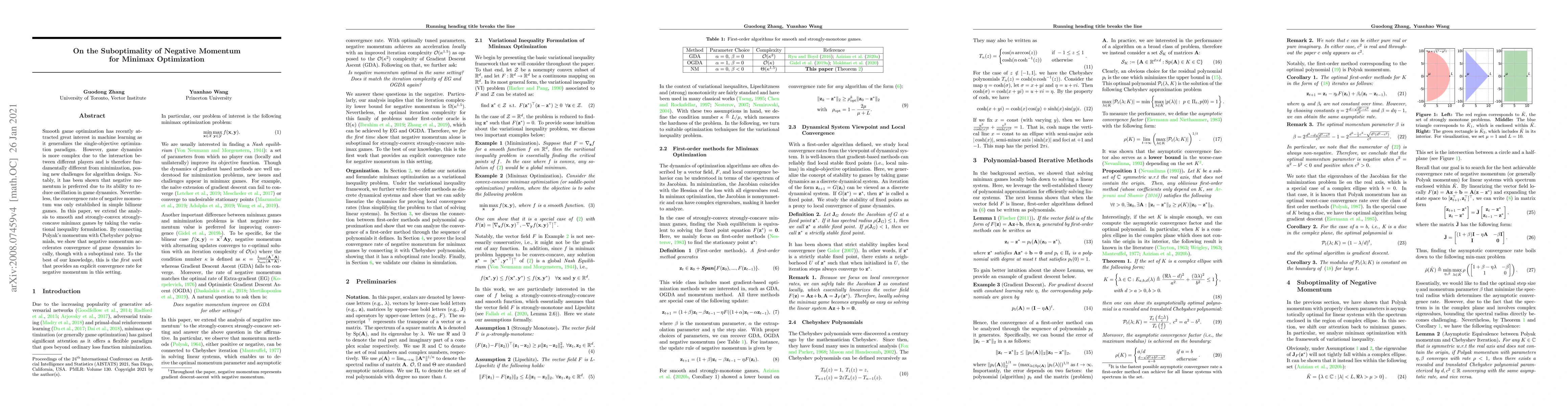This paper investigates negative momentum in minimax optimization for smooth game dynamics, finding that it accelerates convergence locally but with a suboptimal rate, marking the first explicit convergence analysis.