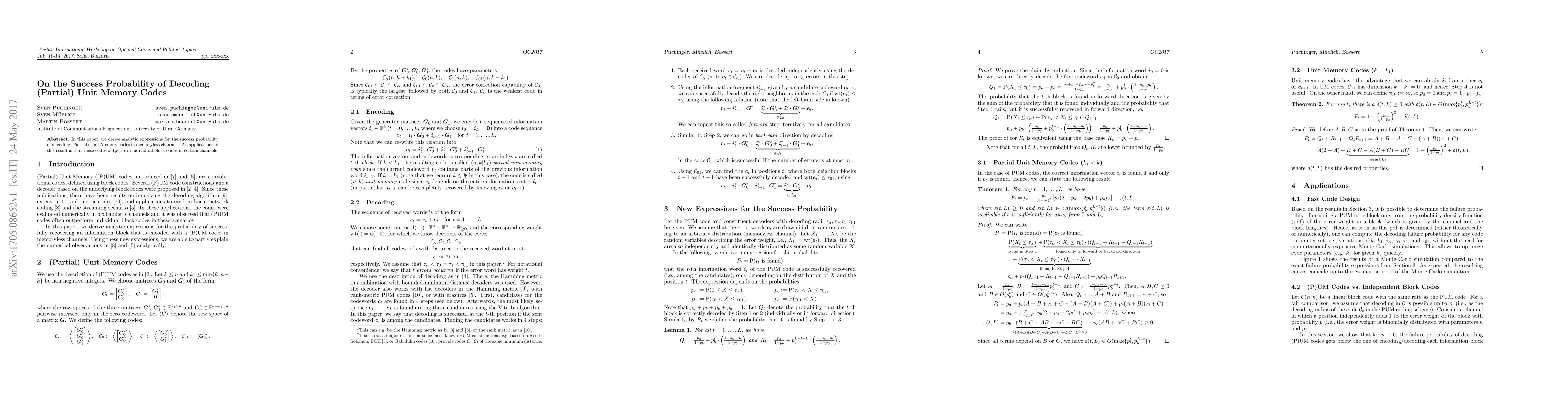 This paper derives analytic expressions for the success probability of decoding Partial Unit Memory codes in memoryless channels, showing they outperform individual block codes in certain channels.