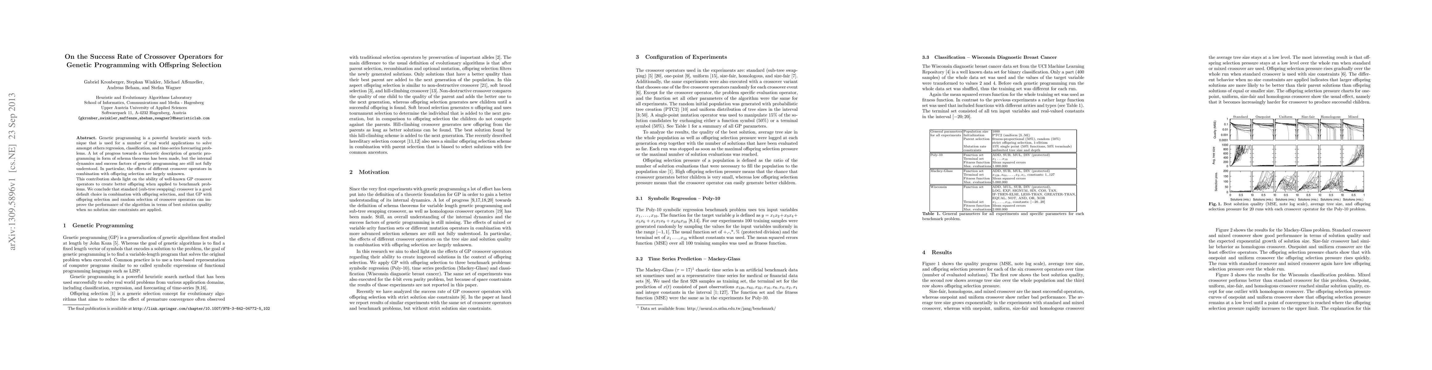 This paper investigates the effectiveness of various crossover operators in genetic programming (GP) when combined with offspring selection. It finds that sub-tree swapping crossover, when used with offspring selection, is a reliable default option, and that random selection of crossover operators can enhance performance without size constraints.
