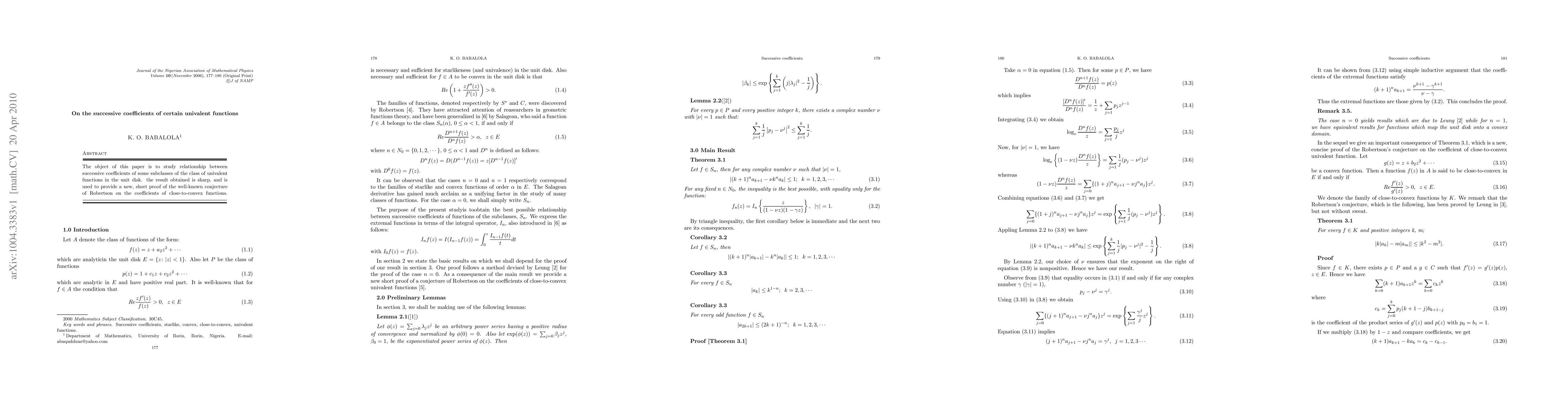 This paper investigates the relationship between successive coefficients of specific subclasses of univalent functions in the unit disk, presenting a sharp result that serves as a concise proof for Robertson's conjecture on the coefficients of close-to-convex functions.