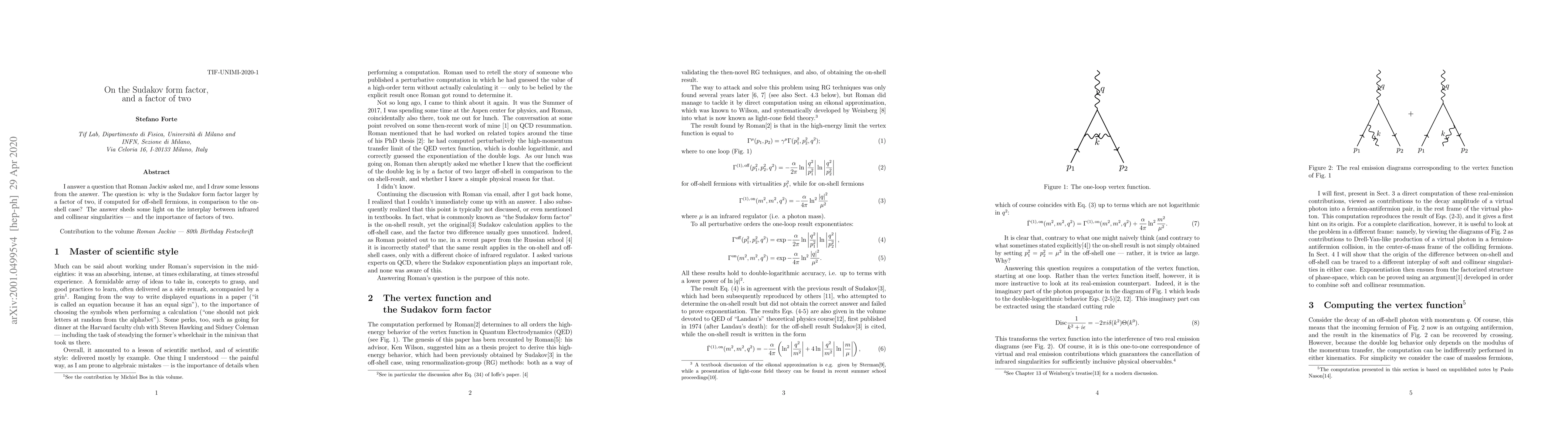 I answer a question that Roman Jackiw asked me, and I draw some lessons from the answer. The question is: why is the Sudakov form factor larger by a factor of two, if computed for off-shell fermions, in comparison to the on-shell case? The answer sheds some light on the interplay between infrared and collinear singularities -- and the importance of factors of two.