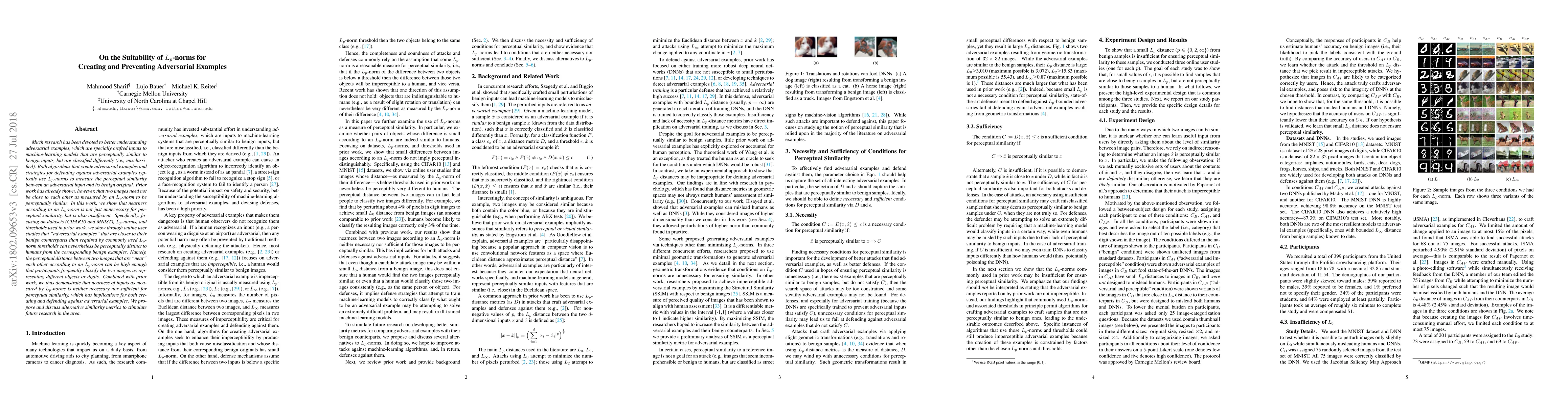 Much research effort has been devoted to better understanding adversarial examples, which are specially crafted inputs to machine-learning models that are perceptually similar to benign inputs, but are classified differently (i.e., misclassified). Both algorithms that create adversarial examples and strategies for defending against them typically use $L_p$-norms to measure the perceptual similarity between an adversarial input and its benign original. Prior work has already shown, however, that two images need not be close to each other as measured by an $L_p$-norm to be perceptually similar. In this work, we show that nearness according to an $L_p$-norm is not just unnecessary for perceptual similarity, but is also insufficient. Specifically, focusing on datasets (CIFAR10 and MNIST), $L_p$-norms, and thresholds used in prior work, we show through online user studies that "adversarial examples" that are closer to their benign counterparts than required by commonly used $L_p$-norm thresholds can nevertheless be perceptually different to humans from the corresponding benign examples. Namely, the perceptual distance between two images that are "near" each other according to an $L_p$-norm can be high enough that participants frequently classify the two images as representing different objects or digits. Combined with prior work, we thus demonstrate that nearness of inputs as measured by $L_p$-norms is neither necessary nor sufficient for perceptual similarity, which has implications for both creating and defending against adversarial examples. We propose and discuss alternative similarity metrics to stimulate future research in the area.