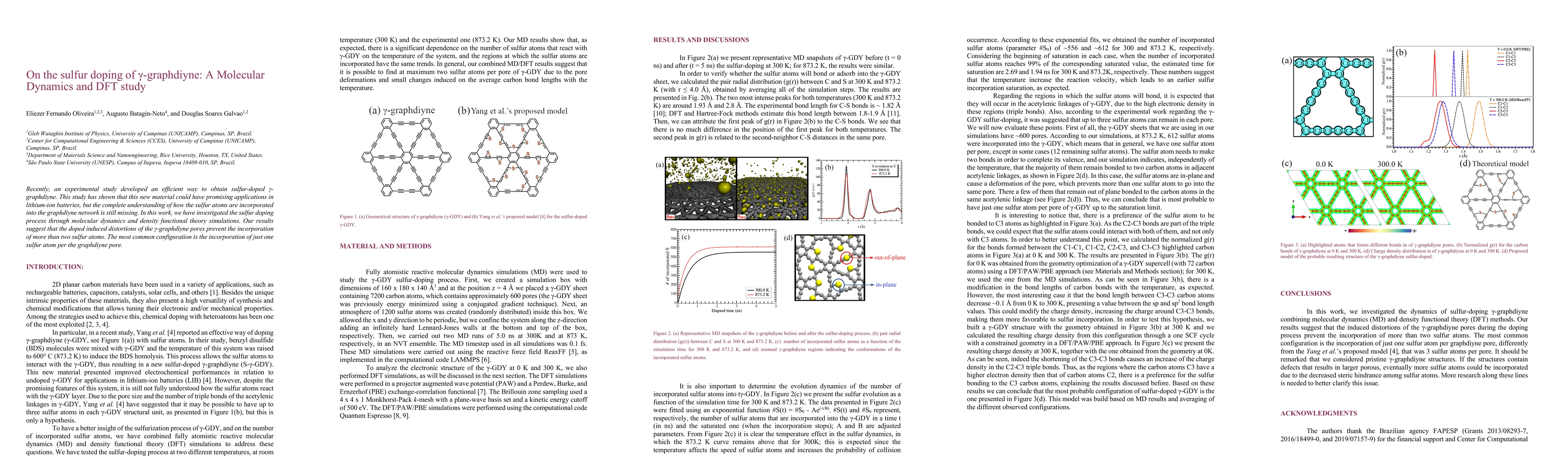 This study uses molecular dynamics and DFT simulations to explore sulfur doping in gamma-graphdiyne, revealing that the material's structure limits the incorporation of more than two sulfur atoms, with one sulfur atom per pore being the most common configuration.