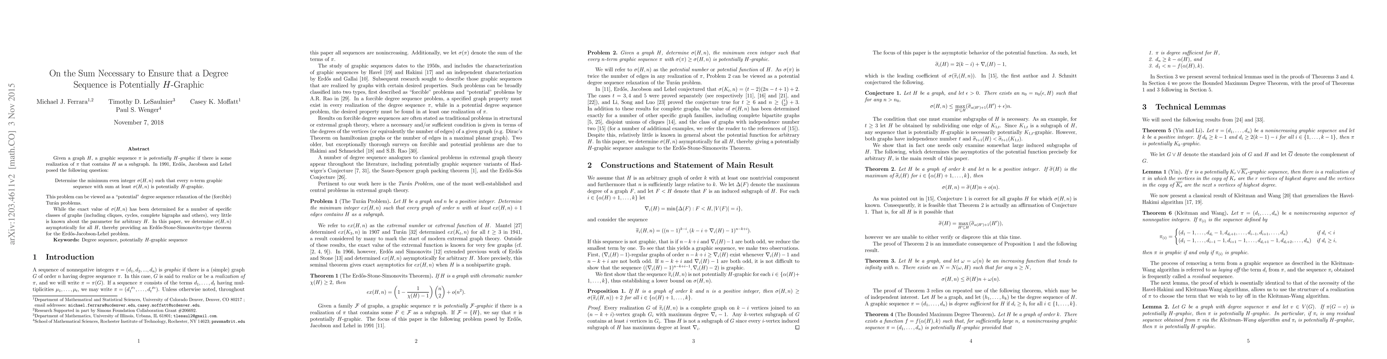 A sequence of nonnegative integers \pi =(d_1,d_2,...,d_n) is graphic if there is a (simple) graph G with degree sequence \pi. In this case, G is said to realize or be a realization of \pi. Degree sequence results in the literature generally fall into two classes: forcible problems, in which all realizations of a graphic sequence must have a given property, and potential problems, in which at least one realization of \pi must have the given property. Given a graph H, a graphic sequence \pi is potentially H-graphic if there is some realization of \pi that contains H as a subgraph. In 1991, Erd\H{o}s, Jacobson and Lehel posed the following question: Determine the minimum integer \sigma(H,n) such that every n-term graphic sequence with sum at least \sigma(H,n) is potentially H-graphic. As the sum of the terms of \pi is twice the number of edges in any realization of \pi, the Erd\H{o}s-Jacobson-Lehel problem can be viewed as a potential degree sequence relaxation of the (forcible) Tur\'{a}n problem, wherein one wishes to determine the maximum number of edges in a graph that contains no copy of H. While the exact value of \sigma(H,n) has been determined for a number of specific classes of graphs (including cliques, cycles, complete bigraphs and others), very little is known about the parameter for arbitrary H. In this paper, we determine \sigma(H,n) asymptotically for all H, thereby providing an Erd\H{o}s-Stone-Simonovits-type theorem for the Erd\H{o}s-Jacobson-Lehel problem.