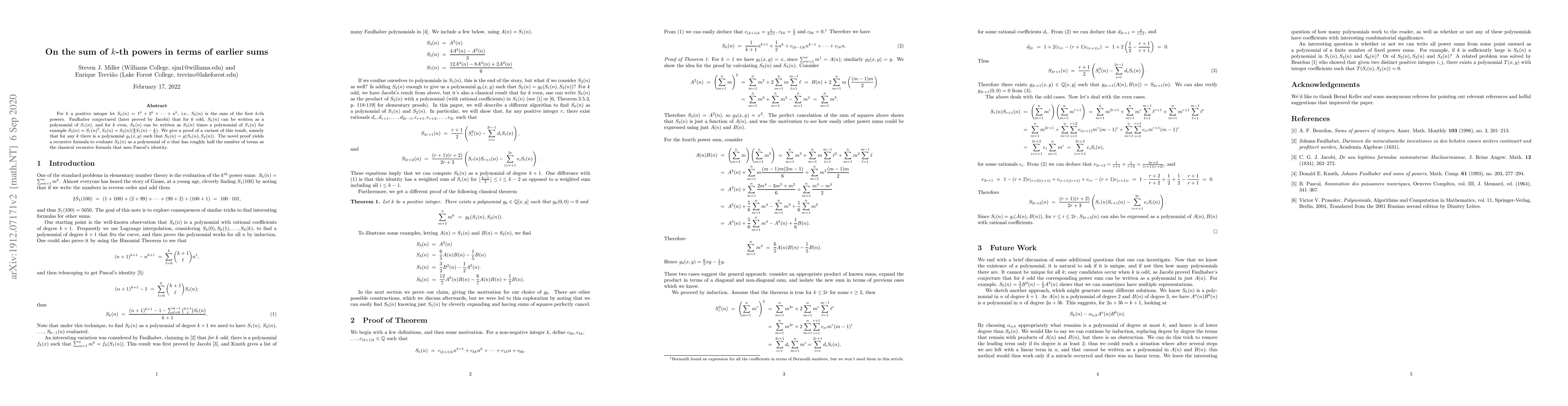 Researchers extend Faulhaber's conjecture to prove that k-th power sums can be expressed as polynomials of earlier sum values, leading to a more efficient recursive formula for evaluation.
